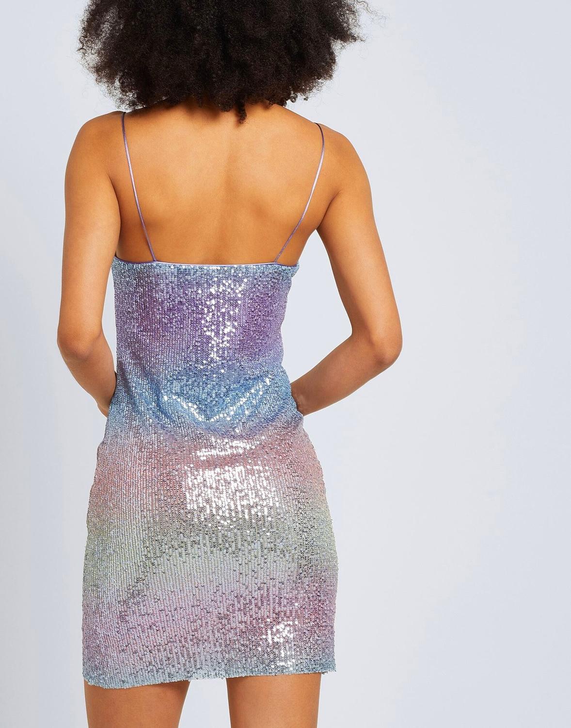 Это короткое платье из тюля, сделанное в Италии, струится по силуэту благодаря изысканному приталенному крою. Платье на подкладке, украшено разноцветными пайетками, широким квадратным вырезом и безрукавкой на тонких бретелях. На модели размер S/40 (итальянский).