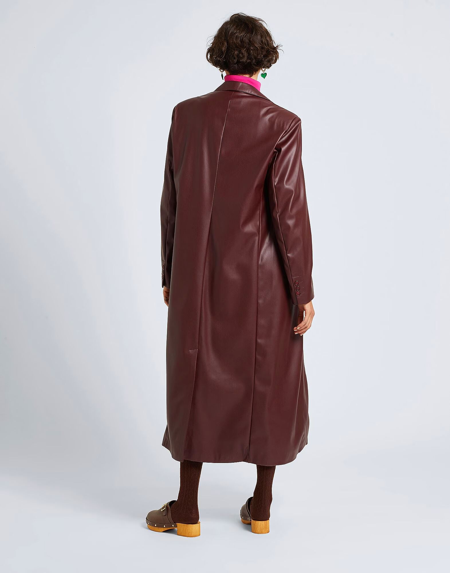 Это однобортное пальто с длинными рукавами выполнено из однотонной ткани с покрытием. Сделано в Италии. На подкладке, имеет два боковых кармана, нагрудный карман и застёжку на три пуговицы спереди. Дизайн дополняют классические лацканы и шлица сзади. На модели размер S/40 (итальянский).