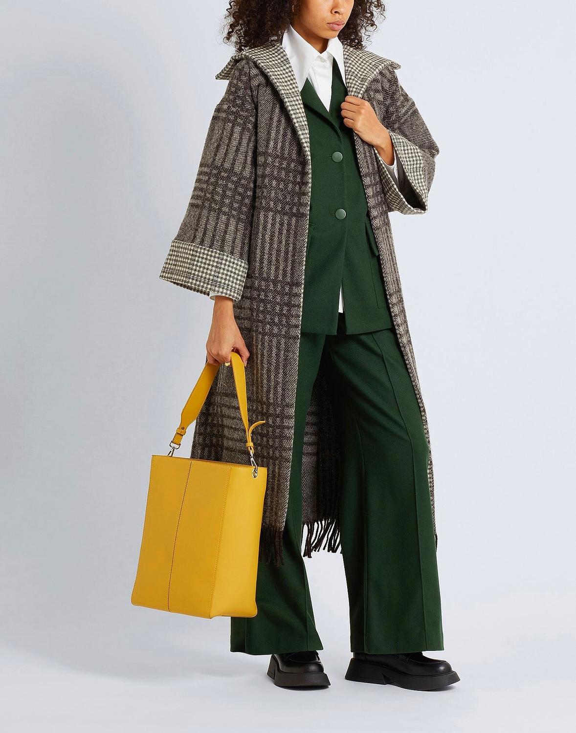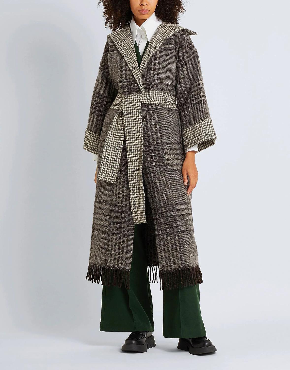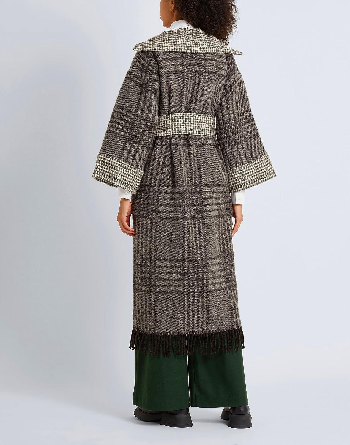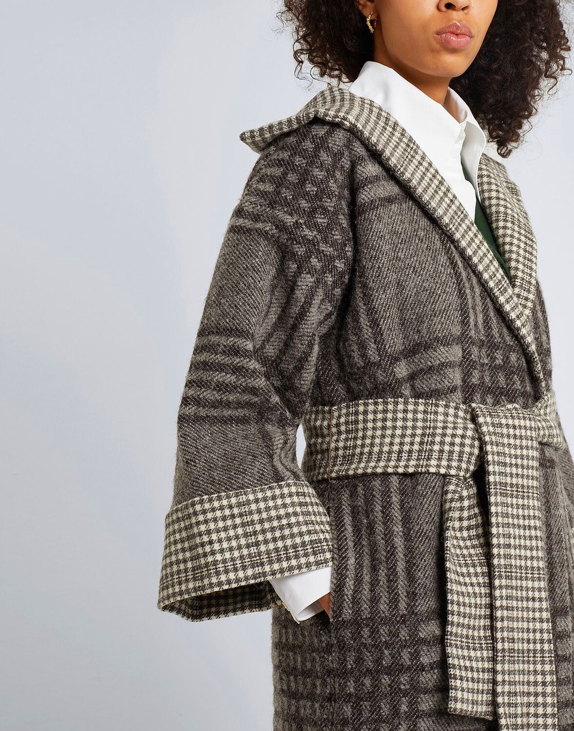Пальто из 100% шетландской шерсти без подкладки с контрастными клетчатыми мотивами, вдохновленное поразительной неровной текстурой Стены Даров в Хайгроув Гарденс: стены, построенной из архитектурного камня, подаренной Его Величеству Королю. Это пальто с поясом и без отделки было разработано и изготовлено по модели 100% безотходного производства, при которой используется каждый компонент материала.