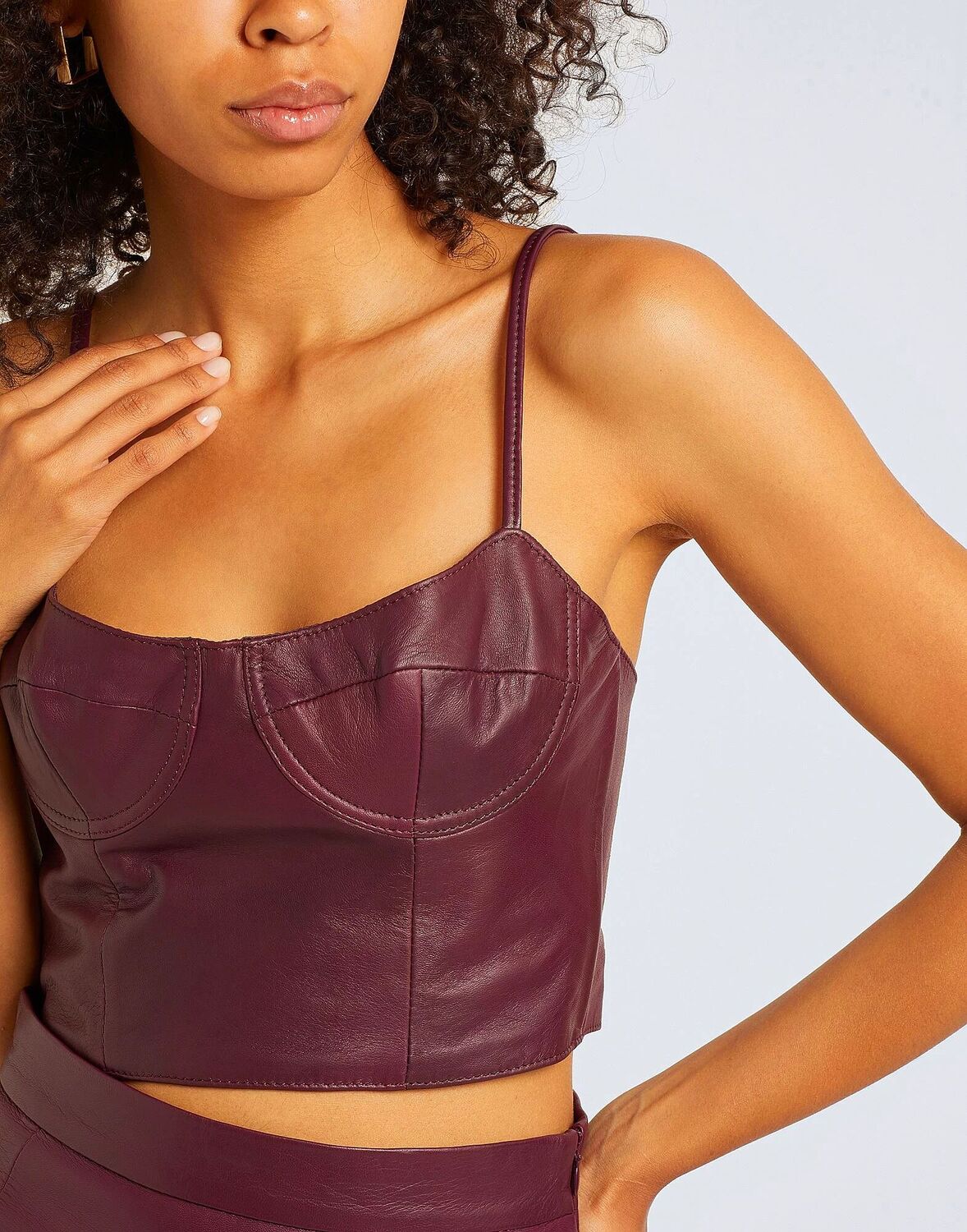 Этот топ изготовлен в Италии из однотонной кожи и имеет облегающий крой, подчеркивающий силуэт. Подкладка внутри, тонкие бретели и застёжка на крючок сзади обеспечивают удобство надевания. На модели представлен итальянский размер S/40.