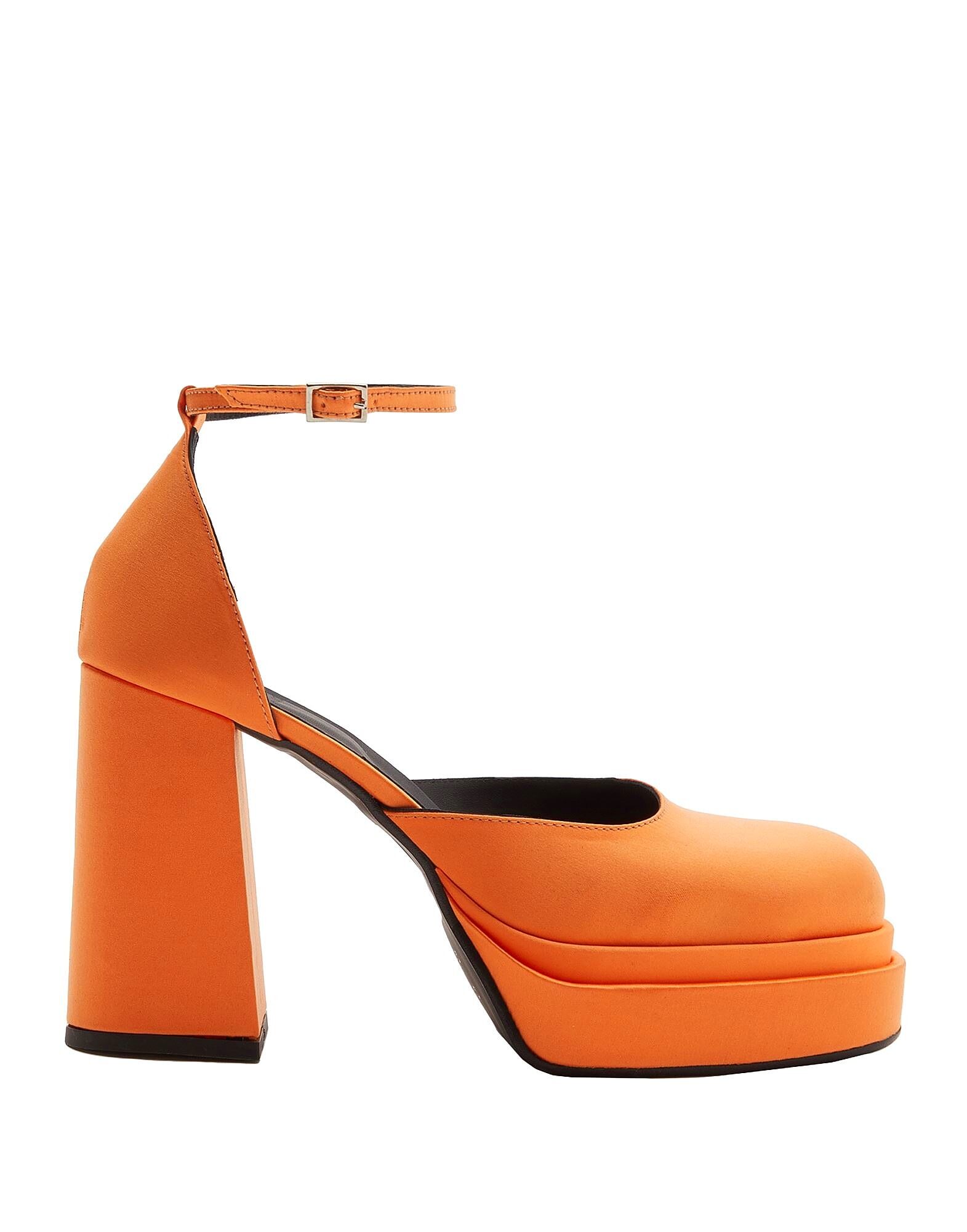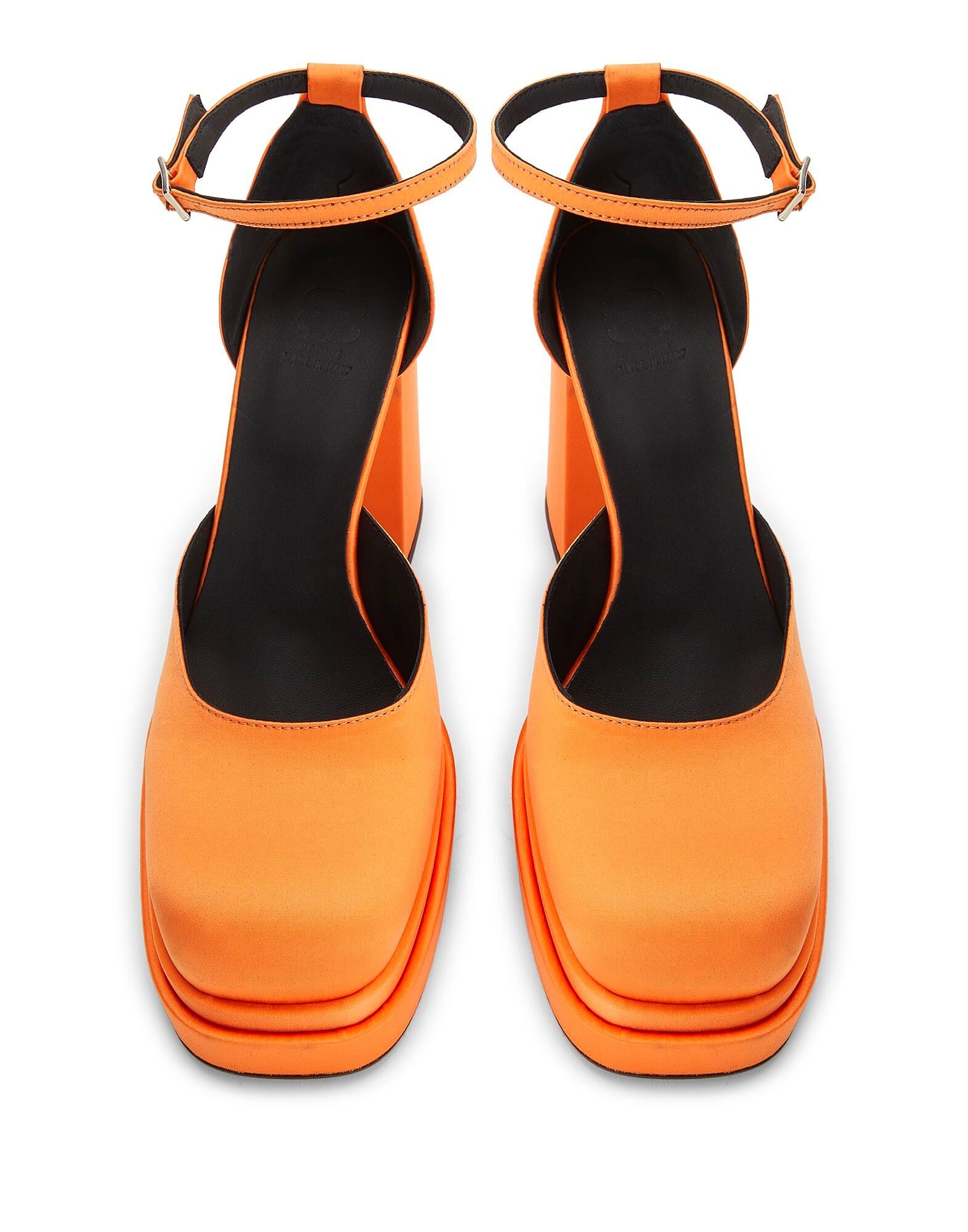 Эти туфли, изготовленные в Италии из гладкого атласа, имеют платформу и блочный каблук. Резиновая подошва дополнена регулируемым ремешком на щиколотке.