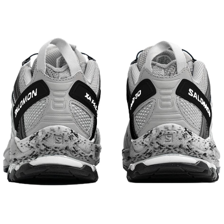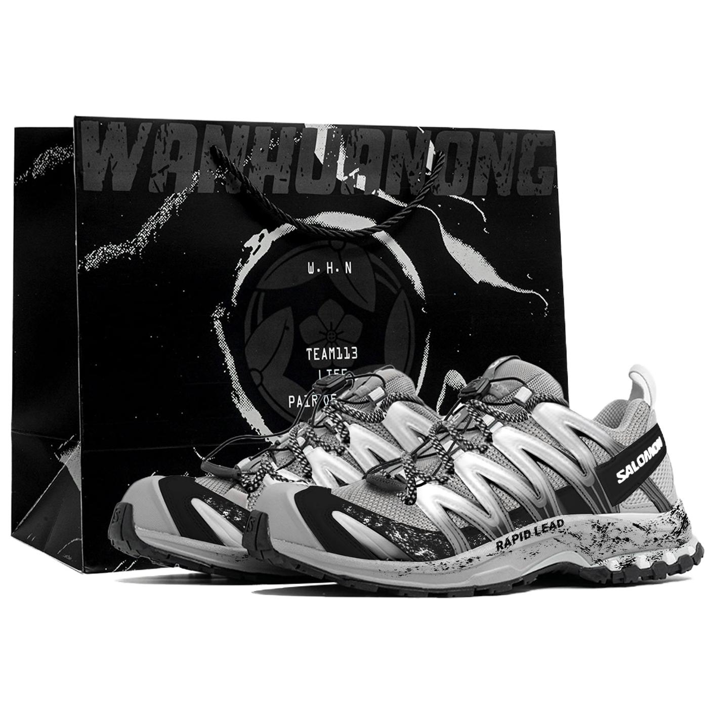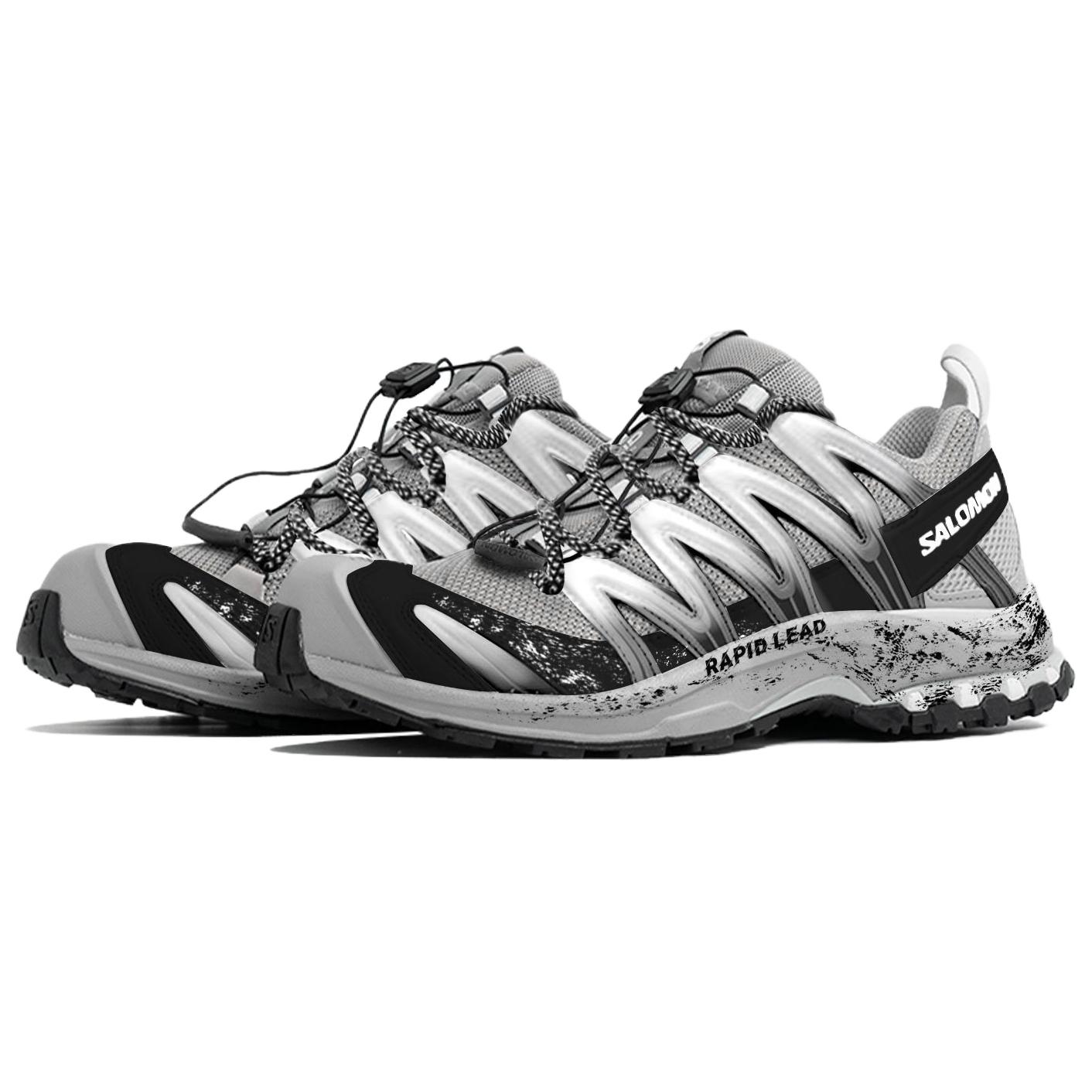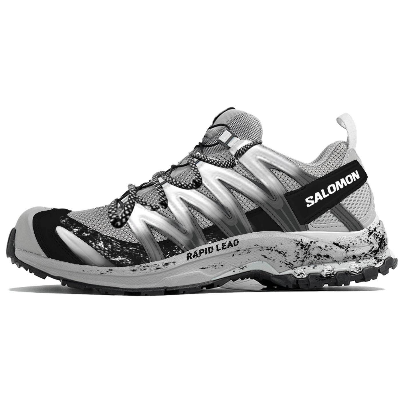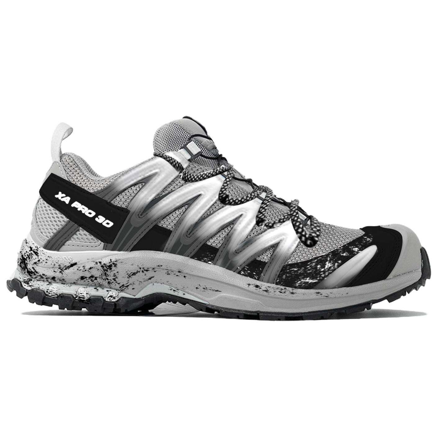 Эти кастомные кроссовки созданы на основе оригинальной модели беговой обуви SALOMON XA PRO 3D. Дизайн вдохновлен сочетанием экстремального трейлраннинга и ретро-индустриального стиля. Цвет, вдохновленный кроссовками для трейлраннинга SALOMON, изменен для создания функциональной серо-черной текстуры. Перфорация улучшает воздухопроницаемость, а эффекты ультрафиолетового излучения и потертости имитируют износ беговой дорожки, подобно следам, оставленным спортсменами после спринта на грязной трассе. Модель сохраняет скоростные качества профессиональных беговых кроссовок, создавая при этом уникальный стильный ретро-стиль, интерпретирующий новаторский подход к лидерству во времени и на беговой дорожке.