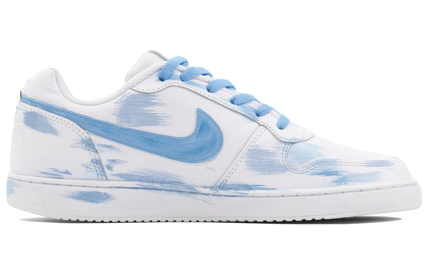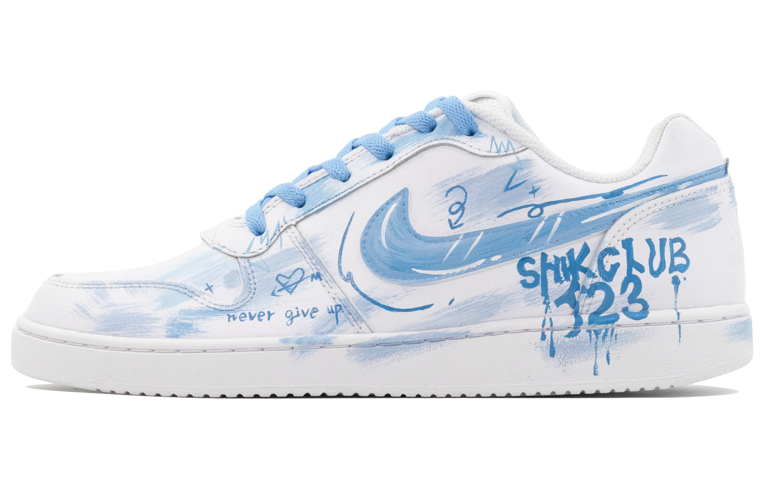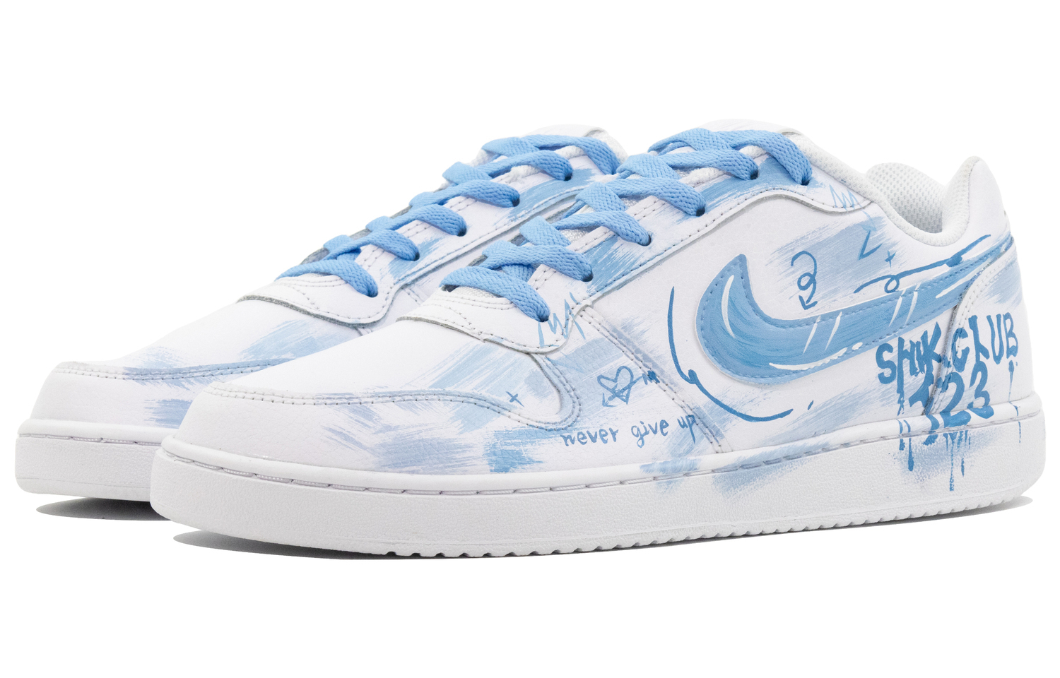 Эти кроссовки изготовлены на заказ на основе оригинальных легких кроссовок Nike EBERNON Low Retro Anti-Slip для мужчин, чисто-белого цвета. Вдохновением послужило межзвездное граффити. Верхняя часть выполнена в стиле дип-дай в сочетании с модным граффити, что придает ей стильный и стильный вид; деконструированная конструкция с двумя шнурками добавляет ощущение многослойности.