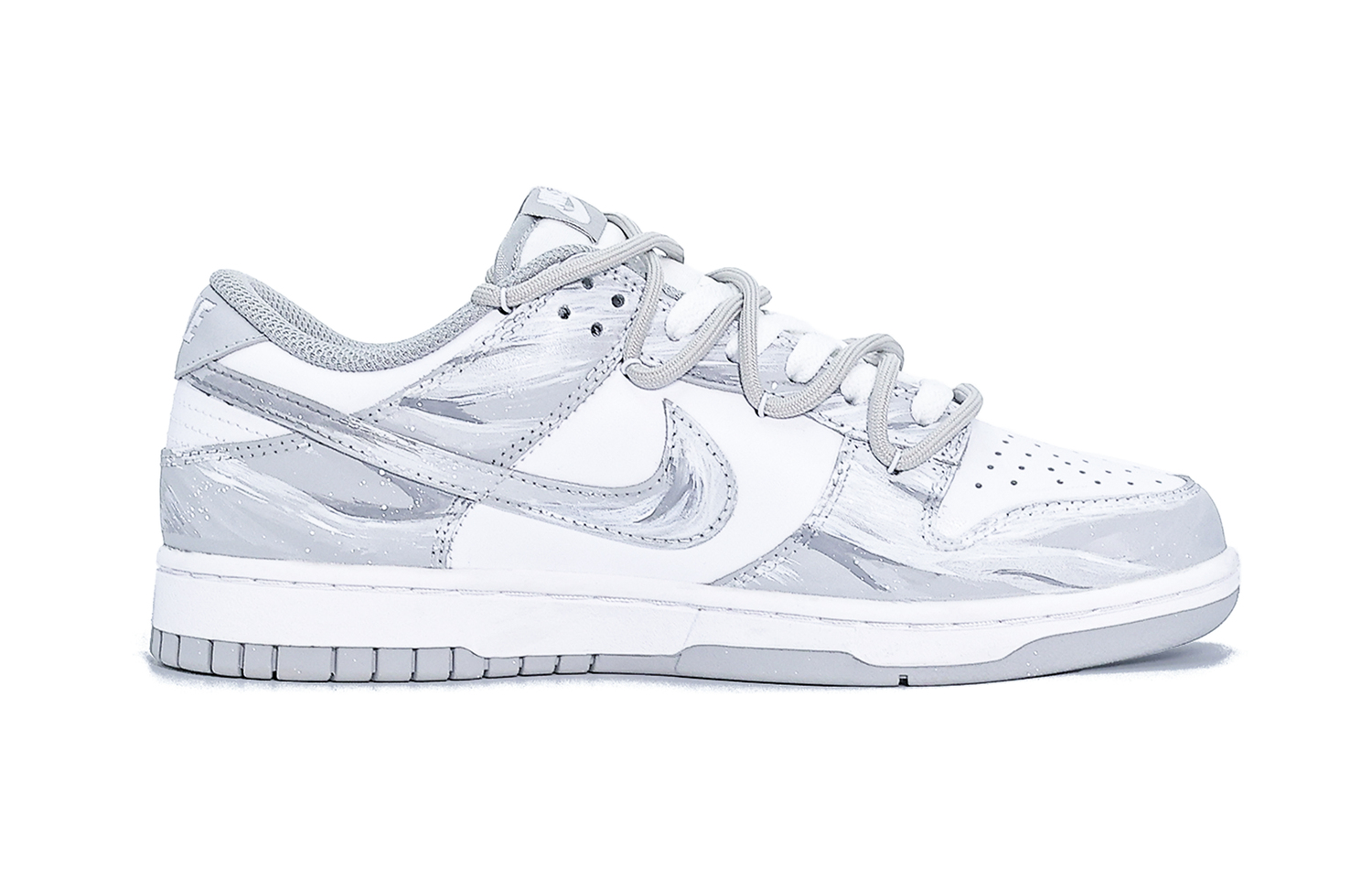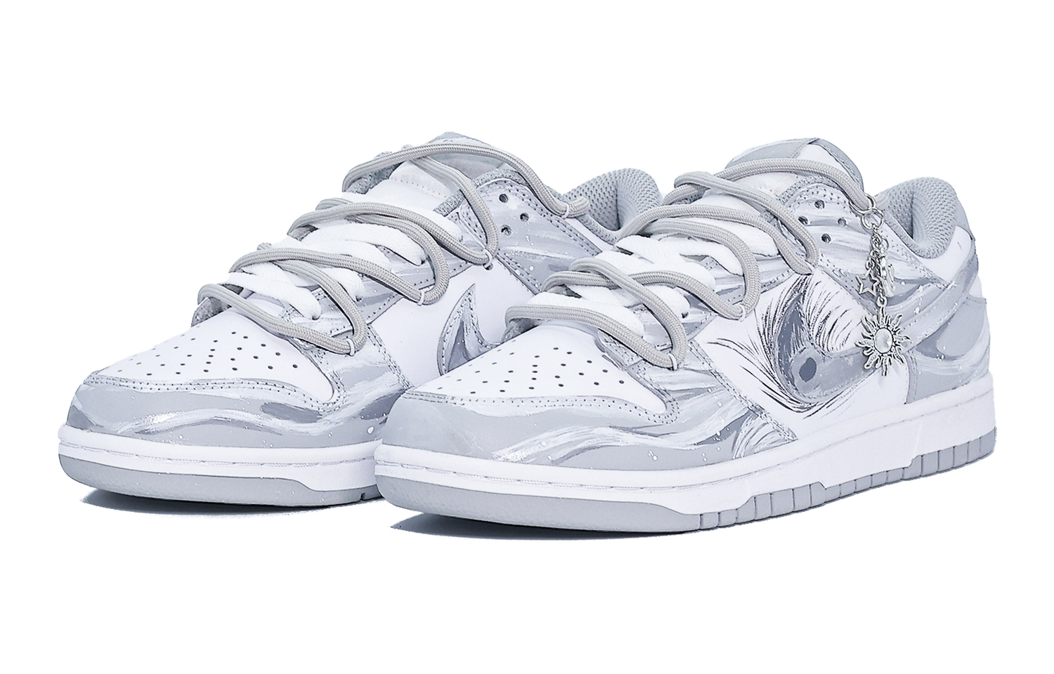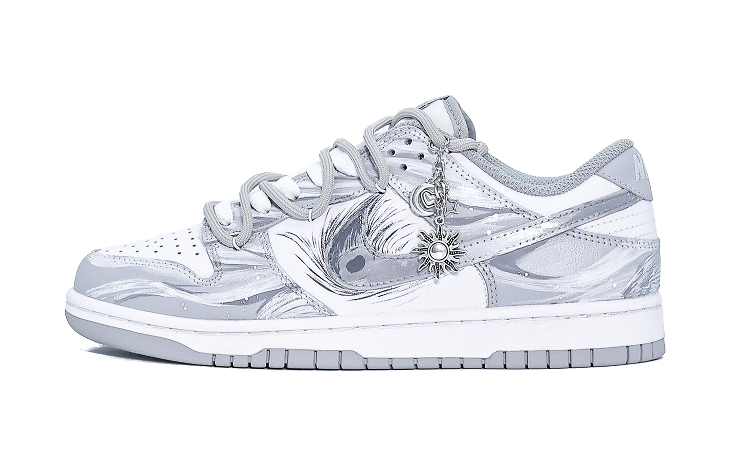 Эти кроссовки, изготовленные по индивидуальному заказу, основаны на оригинальной модели Nike Dunk Retro "Grey Fog" с артикулом DD1391-103 и дополнительными артикулами HF5441-105, HF0730-160, DD1873-113, FB9109-123, DV0831-101, DH9765-001 и DD1503-103. В комплект также входит специальный подарочный пакет (случайного цвета).