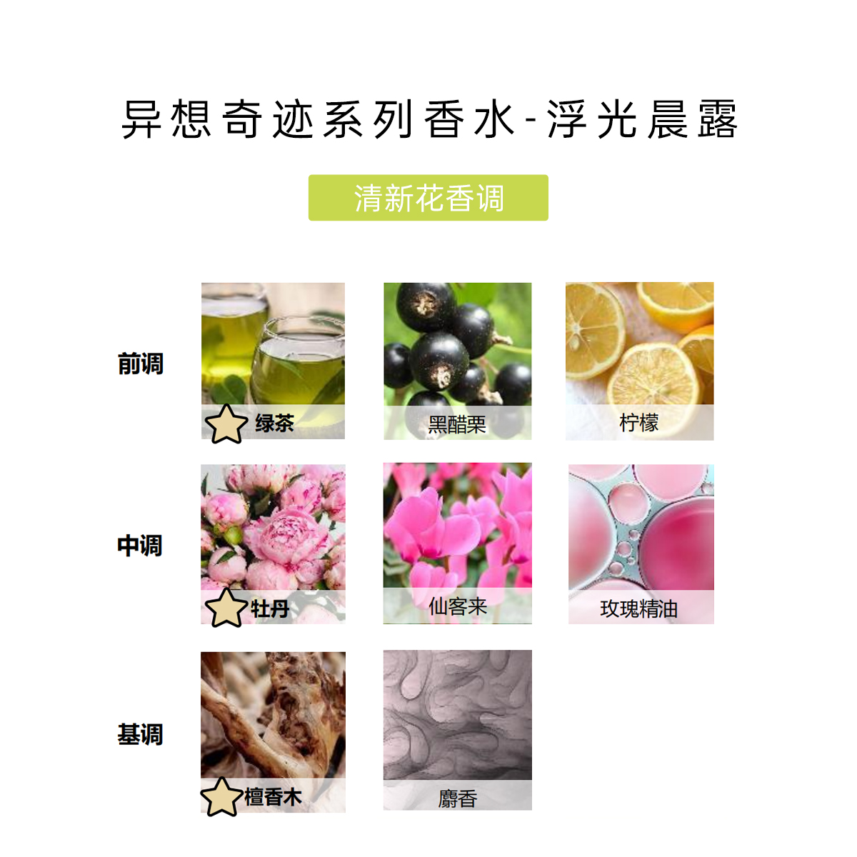 Аромат открывается свежими верхними нотами зеленого чая, лимона и черной смородины, которые создают ощущение прохлады утренней росы и легкой фруктовой свежести. В сердце доминируют цветочные ноты пиона, розы и цикламена, добавляющие романтический, мягкий и женственный характер. В базе звучат сандаловое дерево и розовый мускус, которые смягчают композицию, придавая ей теплую, немного древесно‑мягкую устойчивость.