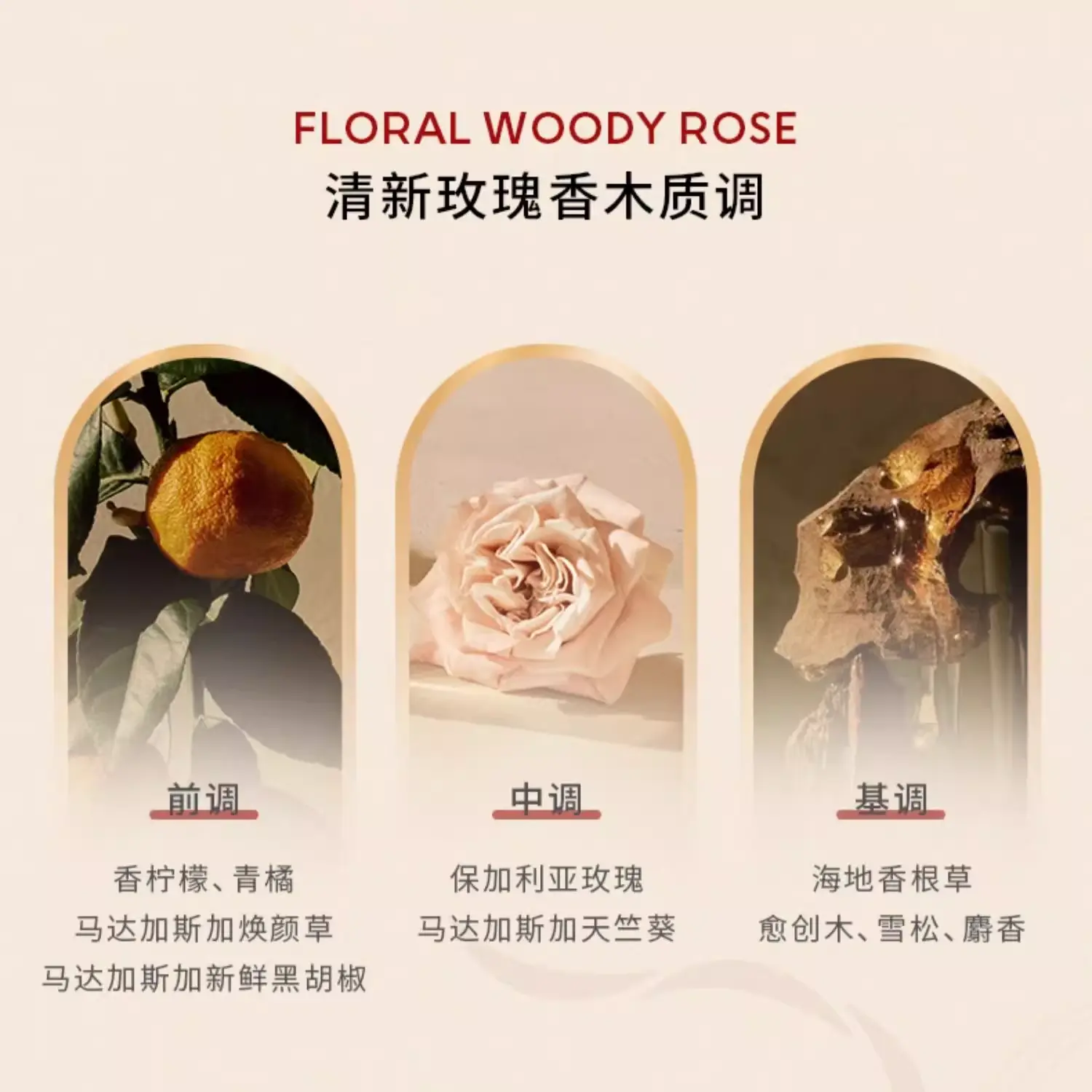 Средние ноты: роза — центральная нота композиции, мягкая, элегантная и естественная; также могут присутствовать другие цветочные акценты, подчеркивающие розу.
