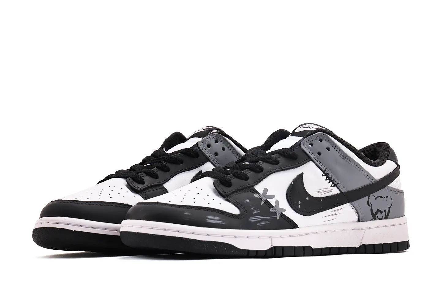 Эти кастомные кроссовки основаны на оригинальной мужской модели Nike Dunk Low. Дизайн вдохновлен ретро-элементами: черно-серая цветовая гамма дополнена мелкими узорами, создающими эффектный контраст. Простой, но изысканный дизайн идеально подходит для повседневной носки, создавая гармоничный образ. Все кастомные кроссовки изготавливаются вручную, и каждая пара будет иметь небольшие вариации.