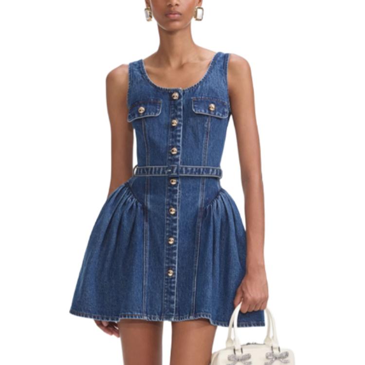 Фасон мини-платья с расклешенным подолом из денима Self-portrait, синий