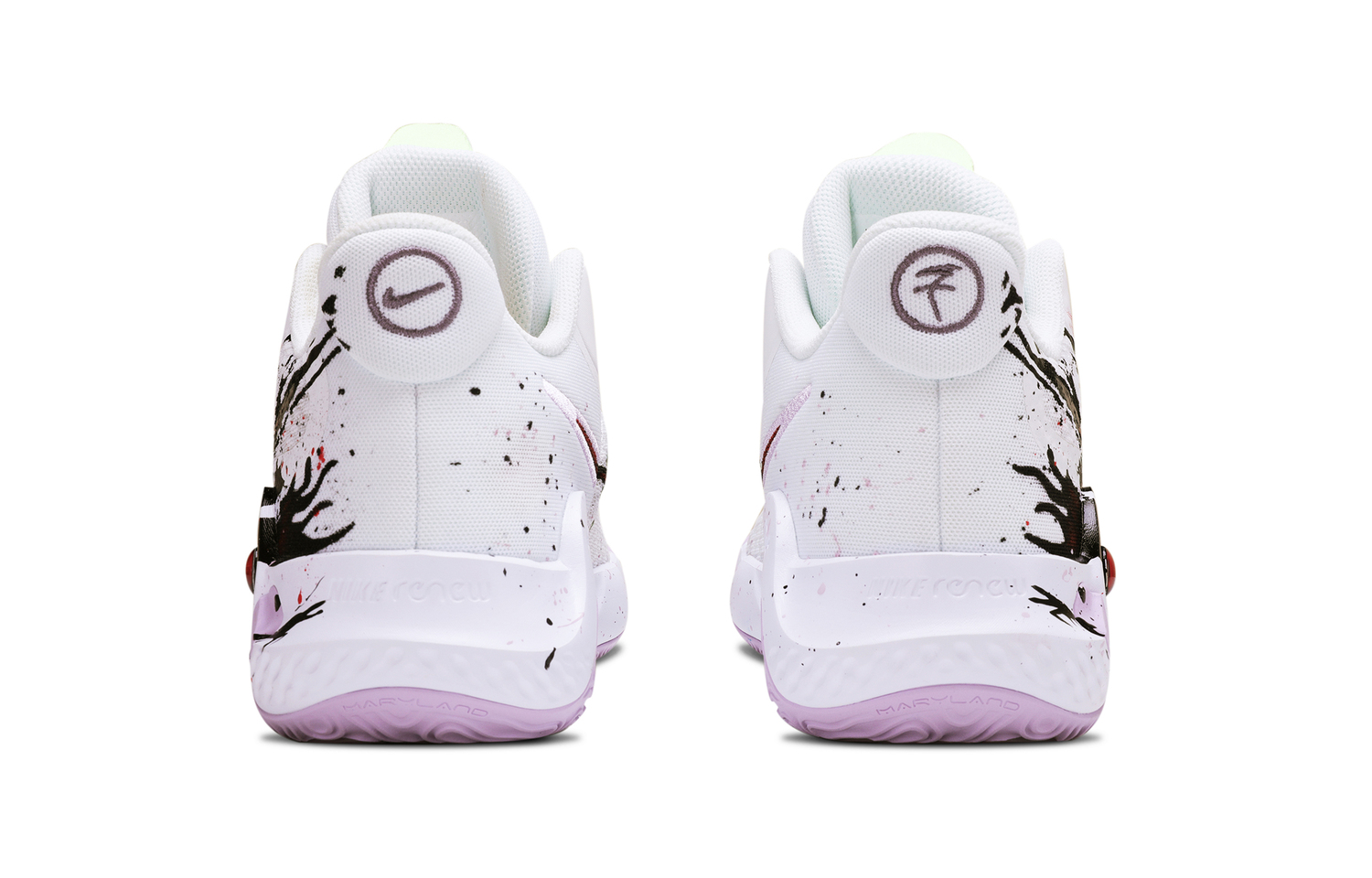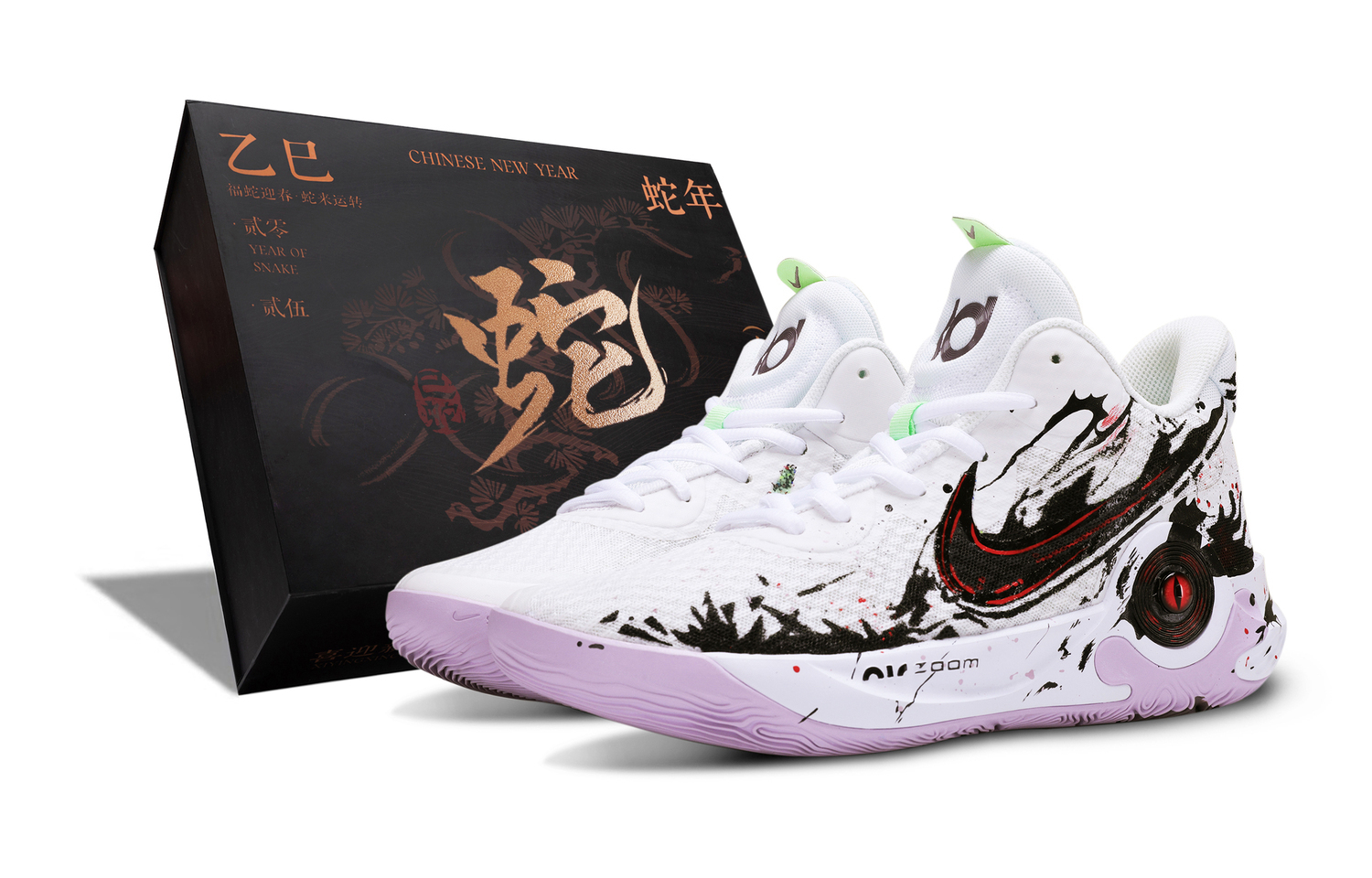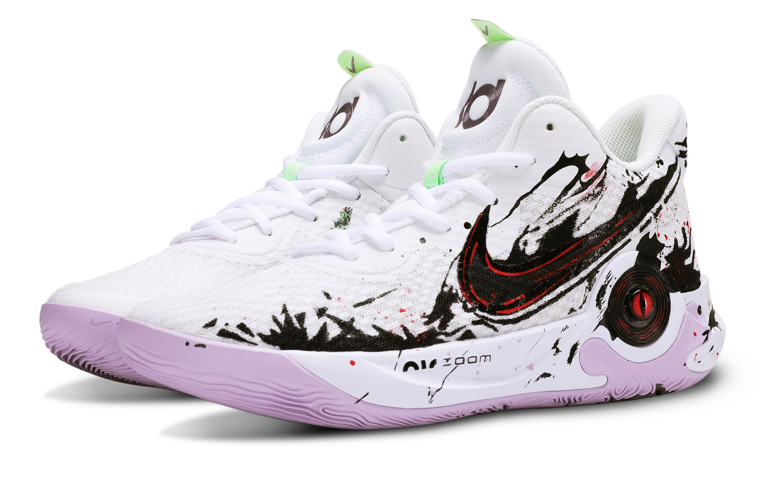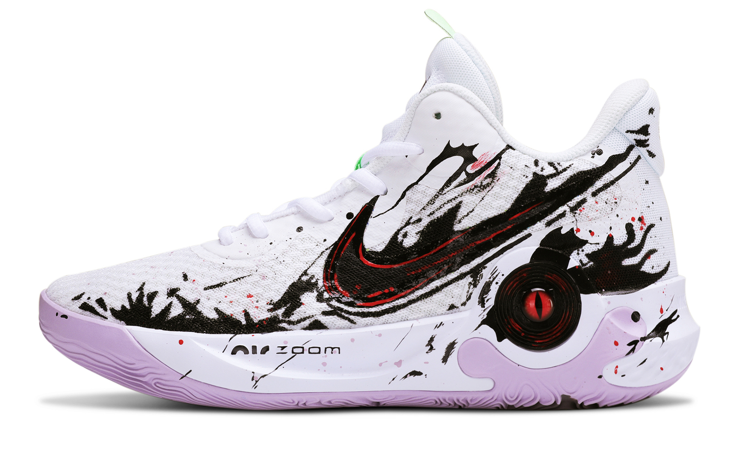 Эти кроссовки, разработанные на заказ, созданы на основе баскетбольных кроссовок Nike KD Trey 5 средней высоты в ретро-стиле, унисекс. Общий дизайн включает в себя множество состаренных и перекрашенных деталей в классической черно-белой цветовой гамме. Детали включают в себя модные граффити и чернильные брызги, подчеркнутые красными линиями, которые подчеркивают темный и дерзкий стиль. В целом, кроссовки выглядят яркими и стильными. Кроссовки можно носить и мыть. Избегайте интенсивной физической активности и использования острых предметов, которые могут поцарапать обувь. Не используйте для чистки концентрированные органические растворители. Используйте мягкую щетку с подходящим моющим средством.
