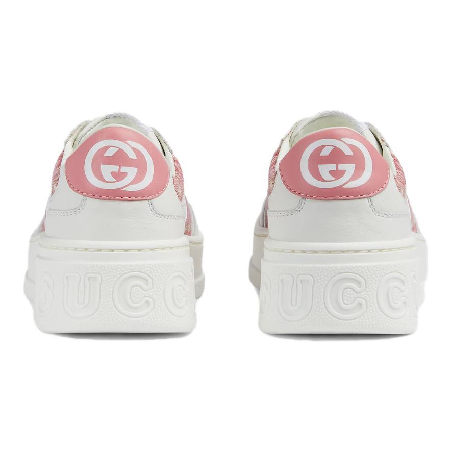Эти белые кожаные кроссовки украшены культовым логотипом в виде двойной буквы G в геометрической версии, а детали из розовой кожи с переплетенными логотипами GG украшают заднюю часть обуви, добавляя фирменный штрих дизайну.