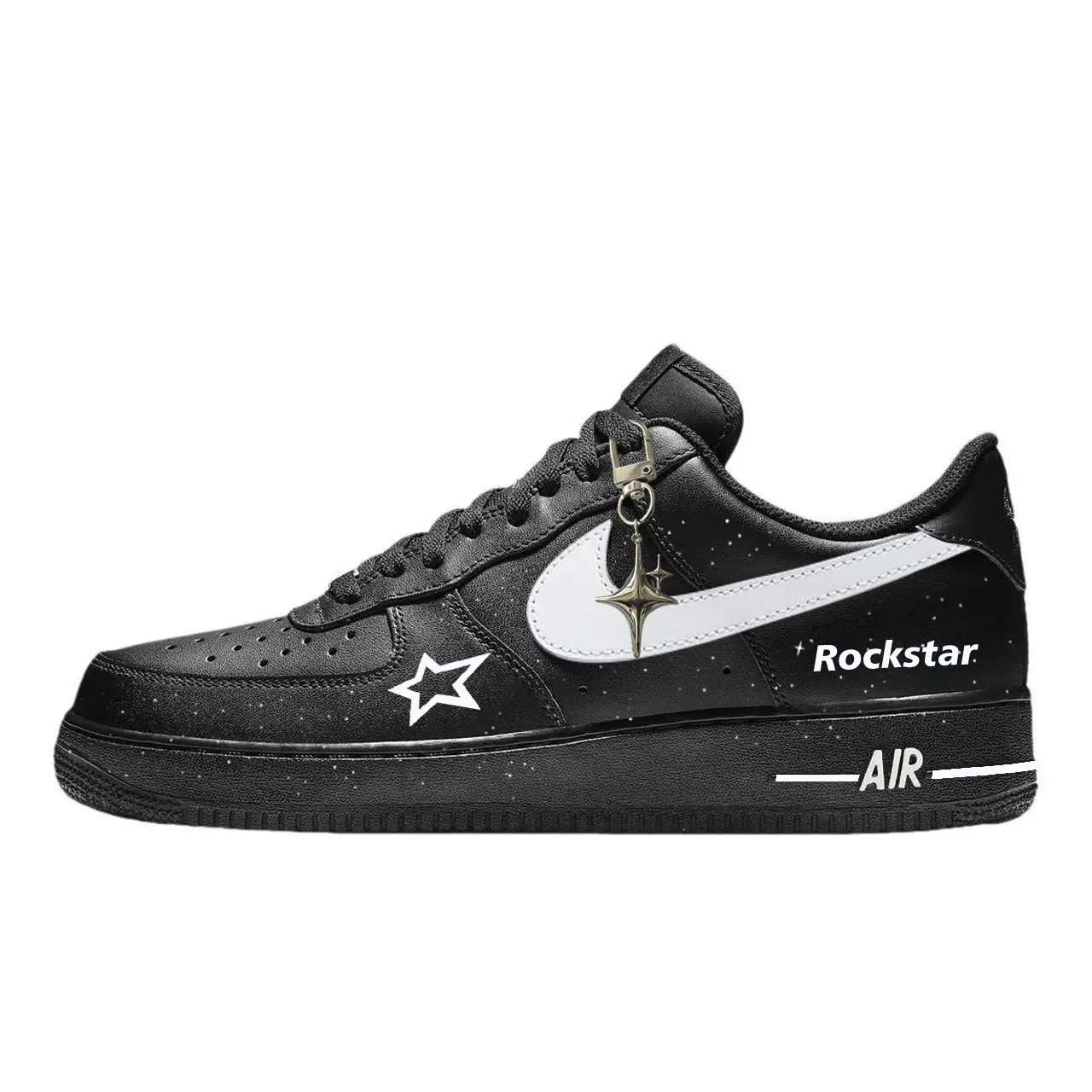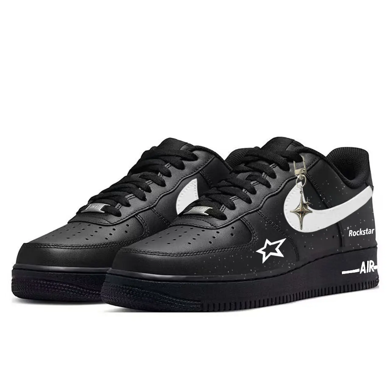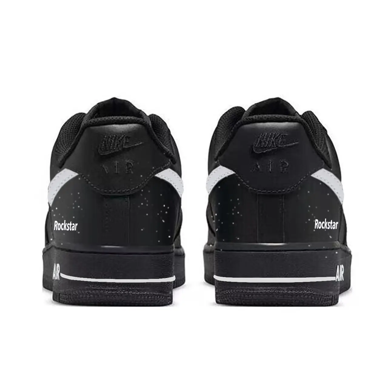 Эти кроссовки созданы на основе оригинальных кроссовок Nike Air Force 1 07 Black Warrior Retro Durable Low-Top, унисекс, черного цвета. Кроссовки оформлены в стиле рок-звезд и выглядят стильно и современно.