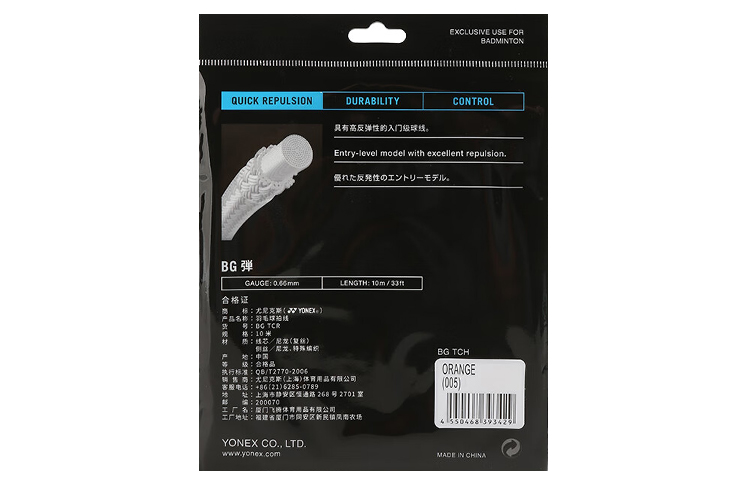 Высокоэластичная струна для бадминтона YONEX BGTCR начального уровня, диаметр 0,66 мм, произведена в Китае. Прочная и экономичная для тренировок и игр.