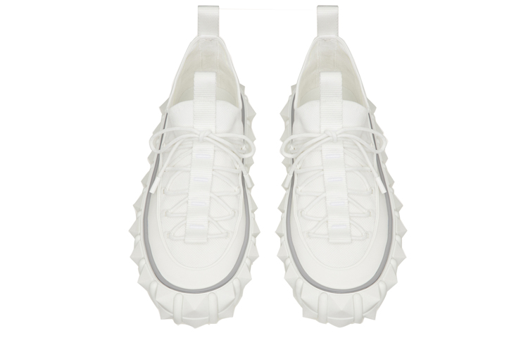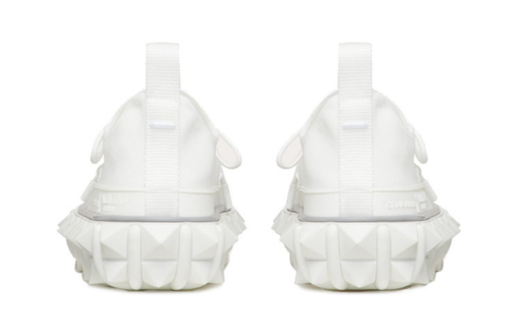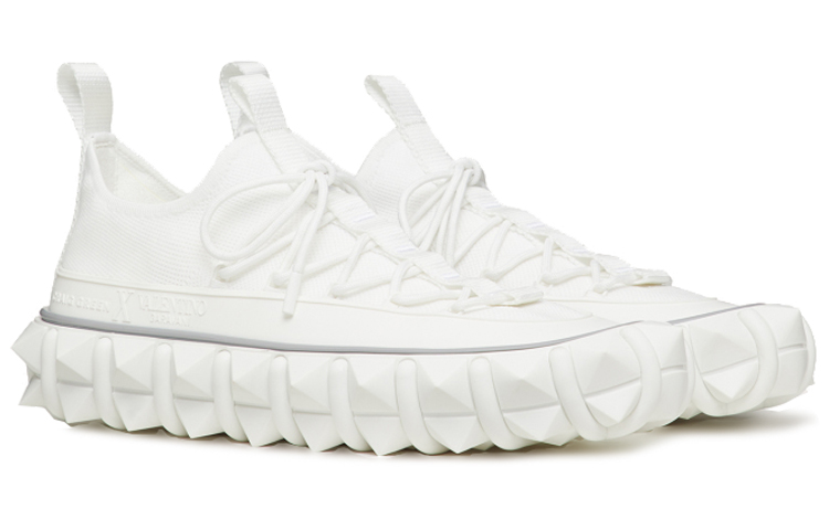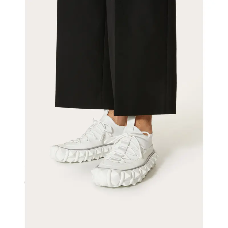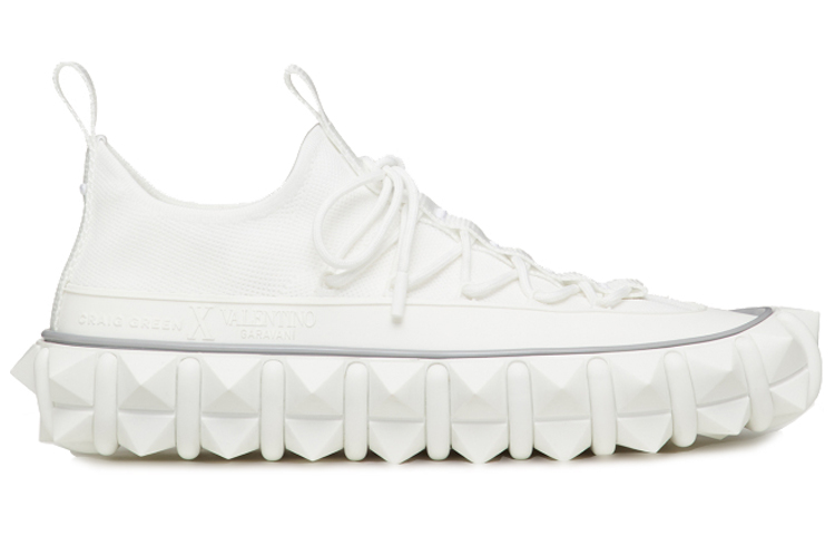 Кроссовки Valentino Garavani ROCKSTUD X Craig Green, созданные в сотрудничестве с другими дизайнерами. Резиновая подошва украшена крупными шипами, логотип Craig Green x Valentino Garavani сбоку и трикотажный верх.