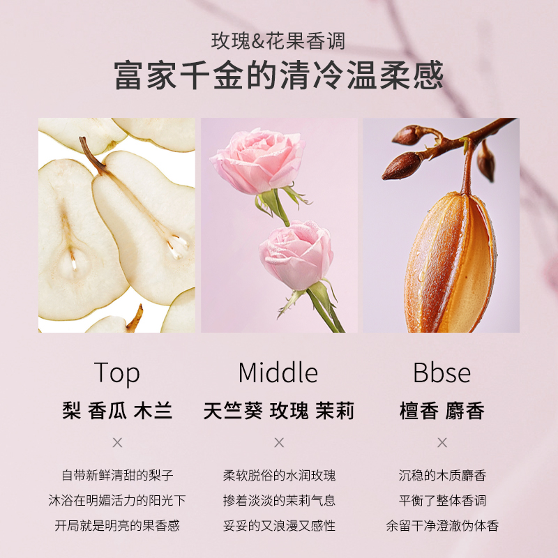 Аромат открывается искрящимися фруктовыми нотами — сочной грушей, спелым персиком и легкой цитрусовой свежестью, которые создают бодрое и приветливое вступление. В сердце композиции доминируют пышные цветочные акценты пиона и жасмина, смягченные нежной сладостью ванили и карамели, что придает аромату женственность и объем. База построена на теплых древесных оттенках сандала и кедра, а также чувственном мускусе и амбровой теплоты, оставляя за собой деликатный и запоминающийся шлейф.