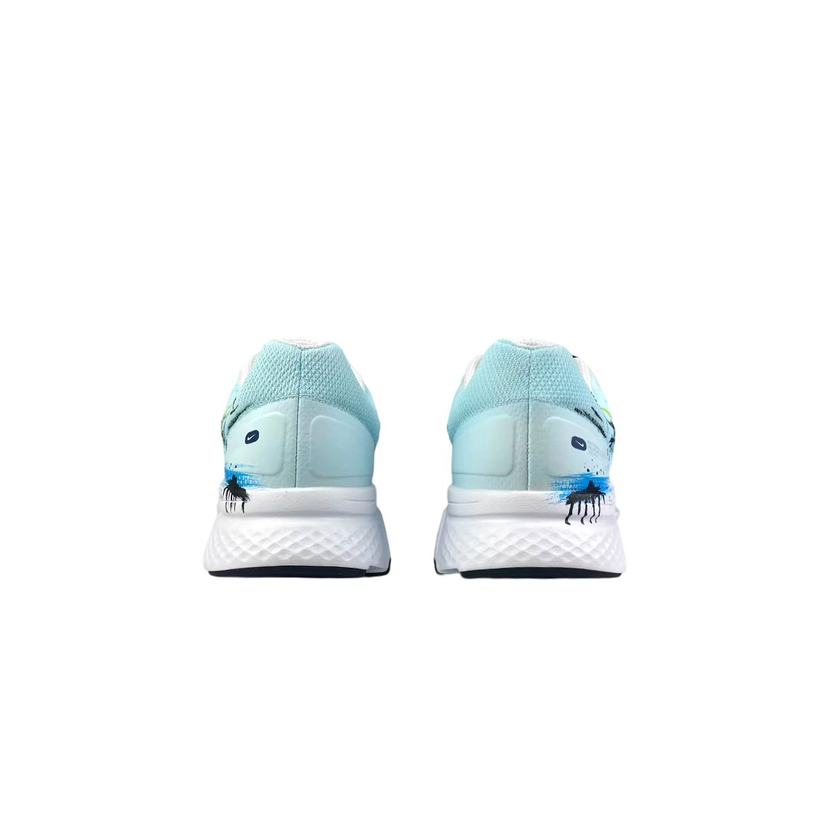 Эти кастомные кроссовки созданы на основе оригинальной модели мужских белых кроссовок Nike Run Swif2 с низким верхом (артикул CU3517-101). Общая цветовая гамма кроссовок - сине-белая, с элементами дизайна в стиле граффити, вдохновленными беговыми штрихами. Синие граффити символизируют траекторию движения, отражая страсть и позволяя шагам перекликаться с искусством.