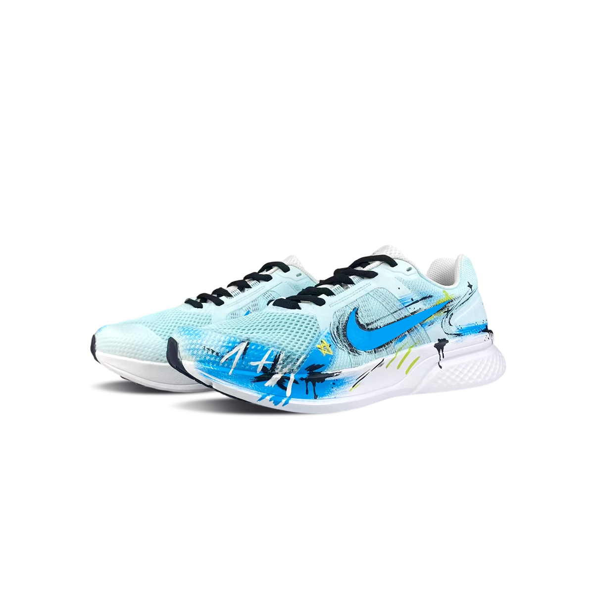 Эти кастомные кроссовки созданы на основе оригинальной модели мужских белых кроссовок Nike Run Swif2 с низким верхом (артикул CU3517-101). Общая цветовая гамма кроссовок - сине-белая, с элементами дизайна в стиле граффити, вдохновленными беговыми штрихами. Синие граффити символизируют траекторию движения, отражая страсть и позволяя шагам перекликаться с искусством.