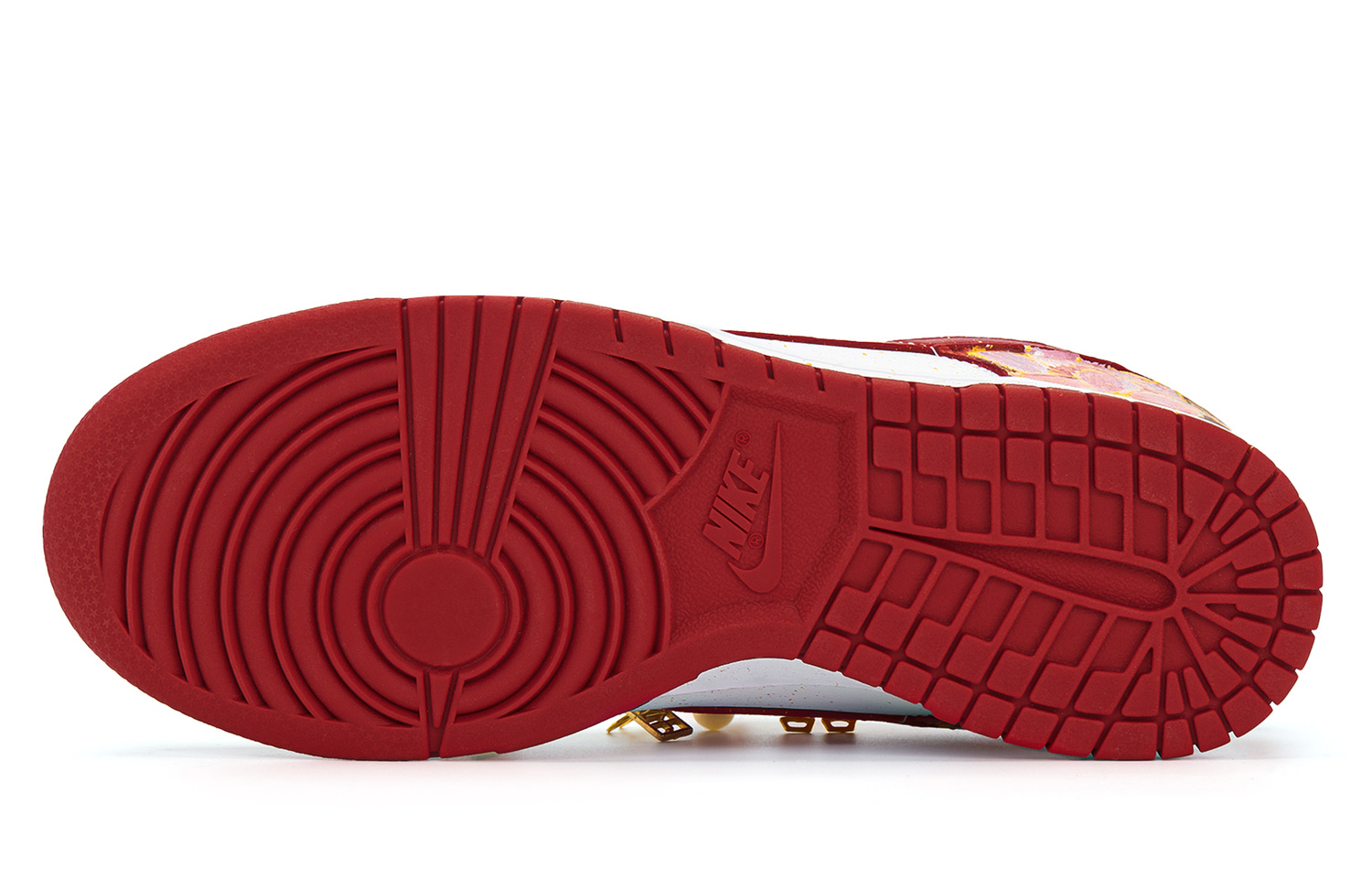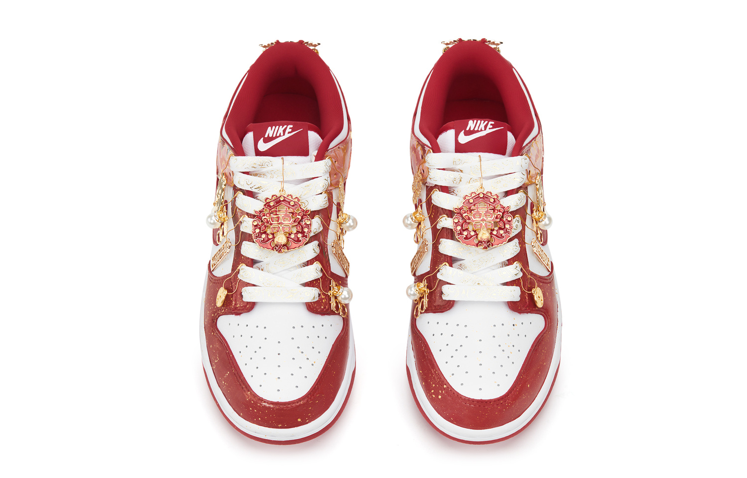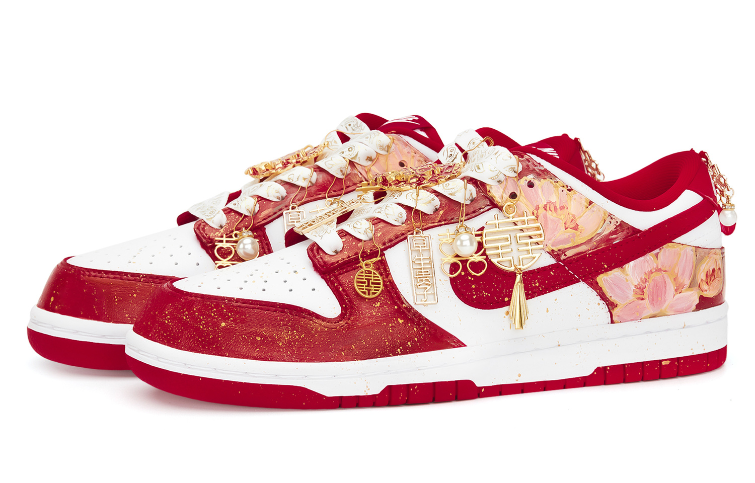 Эта пара обуви имеет артикул DD1873-116. Дизайн этой обуви вдохновлен яркой и красочной эстетикой традиционной китайской культуры. Яркий цветочный узор на верхе словно передает энергию весеннего сада, каждый штрих которого нежен и ярок, демонстрируя нежную элегантность восточного искусства. Иероглиф «囍» (двойное счастье) и другие китайские орнаменты, украшающие обувь, не только обладают традиционным очарованием, но и передают ощущение радости и удачи, символизируя прекрасное ожидание счастливой жизни. Классическая красно-белая цветовая гамма привлекает внимание, сочетая традиционную китайскую торжественность с модным и современным стилем.