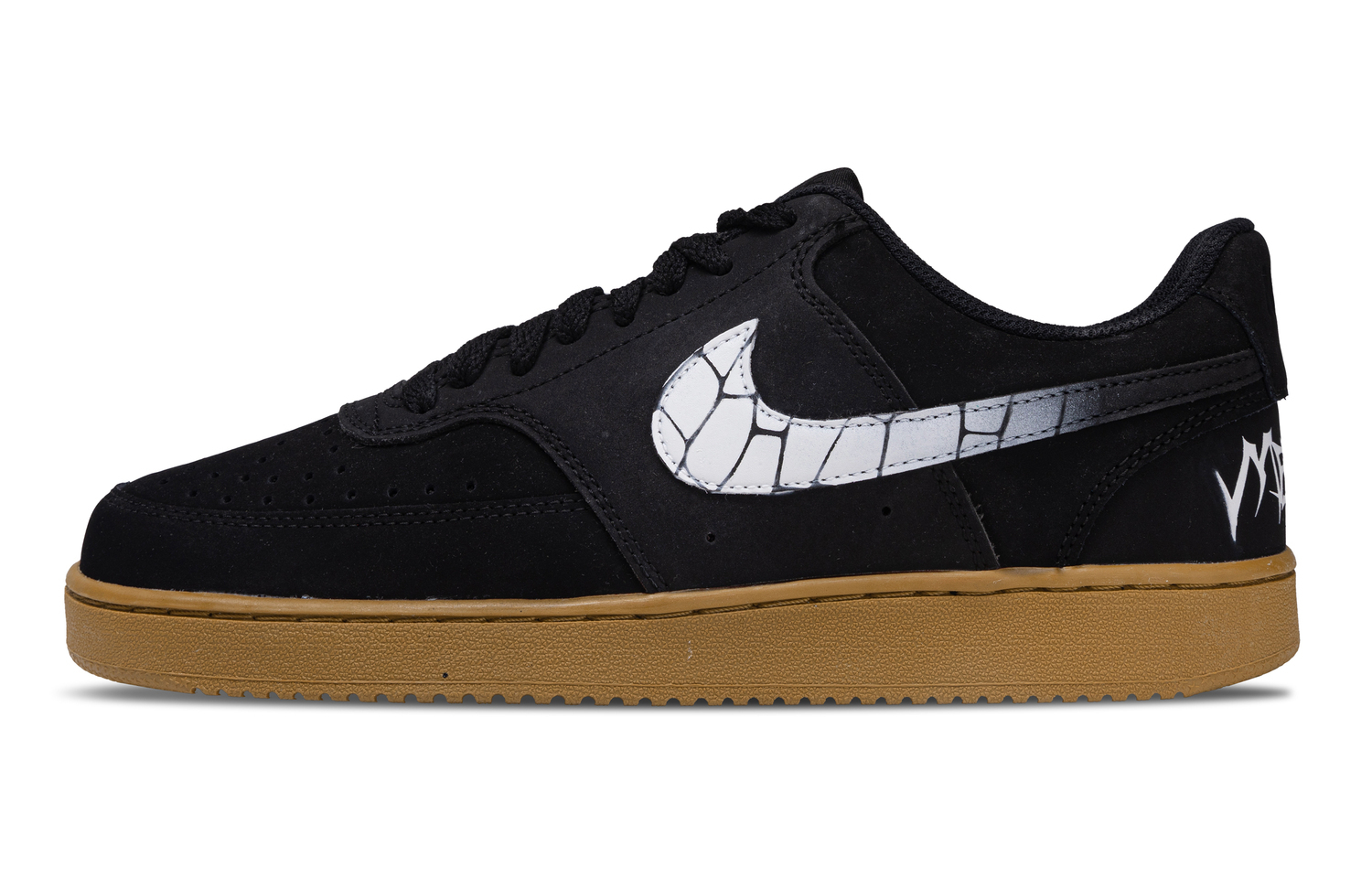 Эти кастомные кроссовки созданы на основе модели Nike Court Vision 1 (код модели CD5463-008) в качестве оригинальной модели. Боковая часть украшена культовой текстурой симбиота, имитирующей его потрескавшуюся текстуру, что делает его легко узнаваемым персонажем. Боковая часть также украшена белыми граффити в стиле Венома, что еще больше подчеркивает особенности персонажа. Преобладающая черная цветовая гамма с резиновой подошвой отражает темный стиль Венома, но при этом добавляет ретро-стиля благодаря классическому черно-белому сочетанию резины. Это умелое сочетание стилей Marvel и уличной моды создает уникальный и визуально яркий образ.