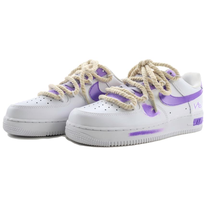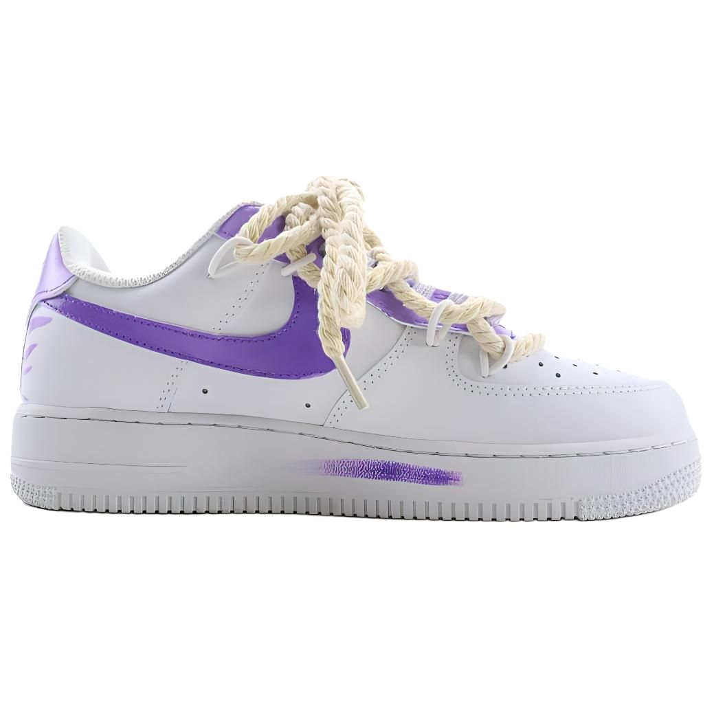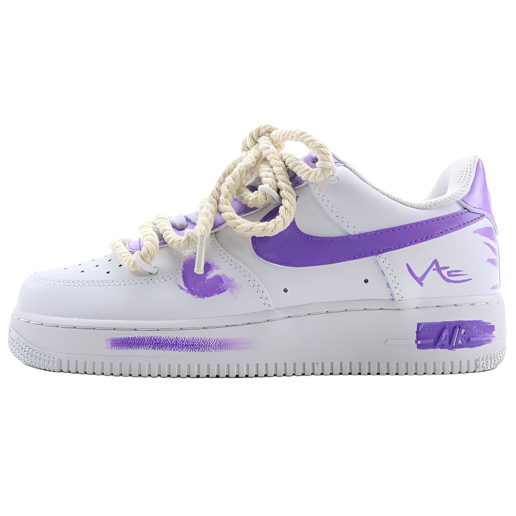 Эти кроссовки, разработанные на заказ, созданы на основе оригинальных низких кроссовок Nike Air Force 1 в ретро-стиле чистого белого цвета. Эти кроссовки Nike Air Force 1 идеально сочетают в себе индивидуальность и модный стиль. Белоснежный верх сочетается с таинственным и романтичным фиолетовым цветом, логотип Swoosh сбоку и фиолетовые мазки кисти на корпусе напоминают импровизированное проявление художественного вдохновения. Уникальный дизайн шнурков, напоминающих толстую веревку, добавляет нотку бунтарского духа. Надпись «VAE» еще больше подчеркивает их уникальный стиль. Эти кроссовки - любимая модель среди модниц; в них каждый шаг источает неповторимый стиль, задающий тренды.
