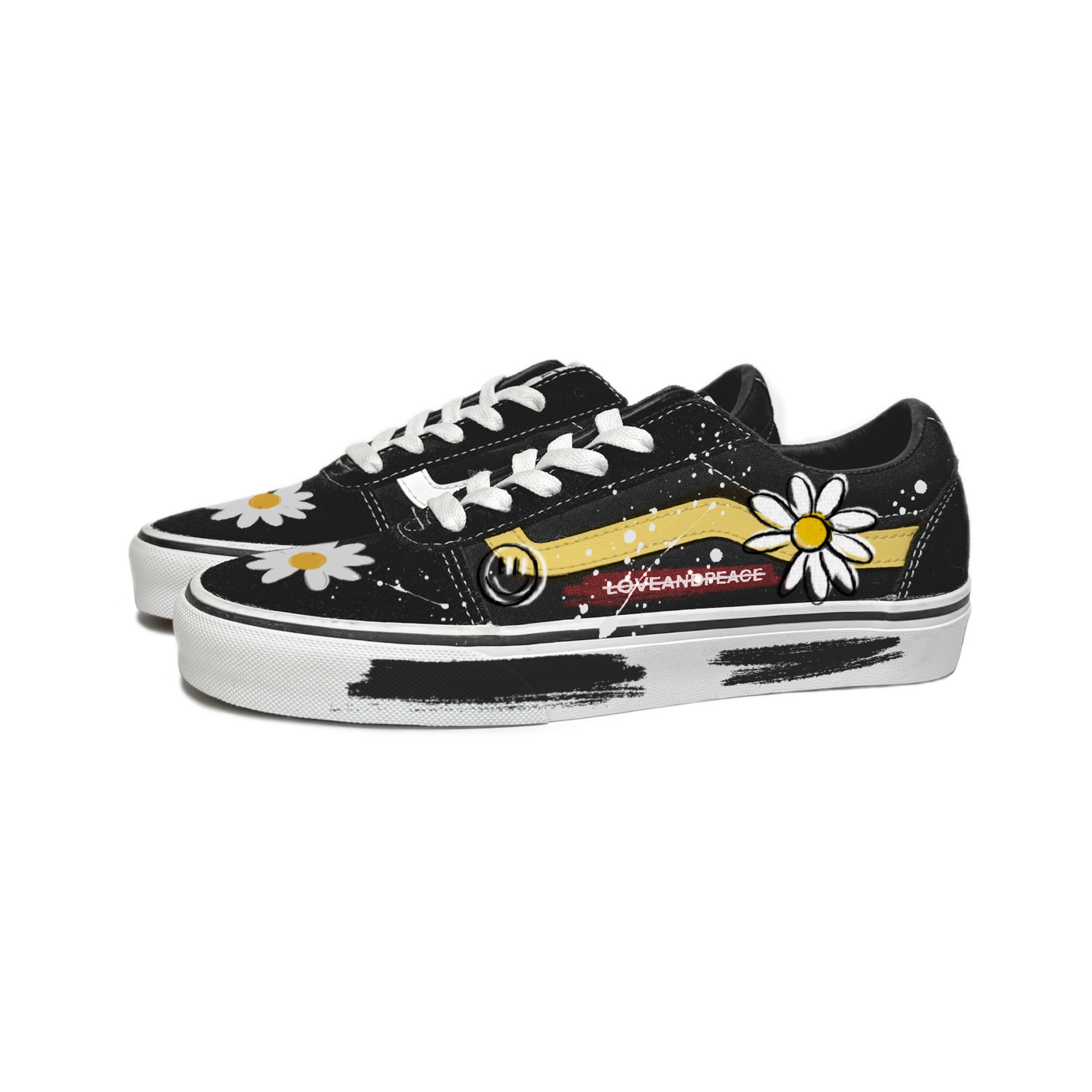 Эти кастомные кроссовки основаны на оригинальной модели Vans. Они украшены уличным граффити и ромашками, что создает модный и стильный образ, а ненасыщенная цветовая гамма позволяет носить их каждый день.