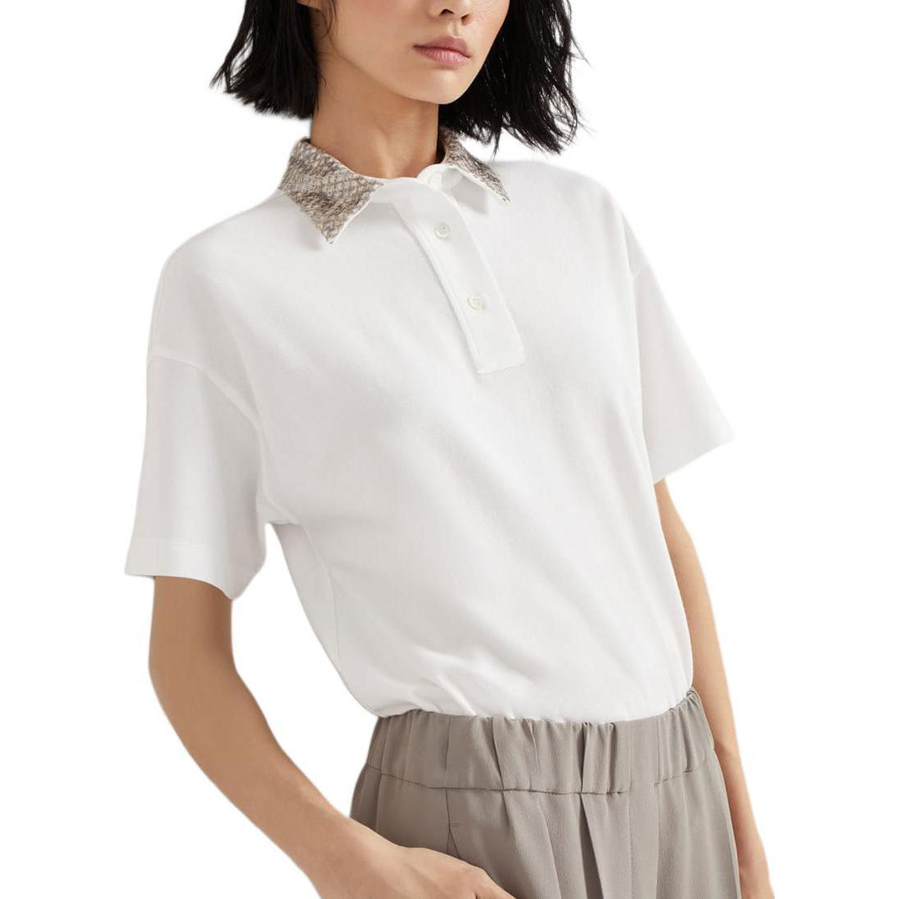Описание: Изящно выполненные мерцающие детали подчеркивают мужественный характер этой рубашки-поло из пике-хлопка. Воротник украшен изысканной мерцающей отделкой, созданной тремя слоями перекрывающихся пайеток, которые резко контрастируют с непринужденной текстурой ткани и подчеркивают привлекательность рубашки-поло. Материал: Сочетание постоянно совершенствующихся высококачественных материалов и дизайна, вдохновленного мужской одеждой, подчеркивает спортивный стиль этой рубашки-поло из чистого хлопка. Благодаря этому ткань легкая, дышащая и приятная на ощупь, что делает ее подходящей для ношения круглый год. Детали: Застежка на пуговицы, 100% хлопок.