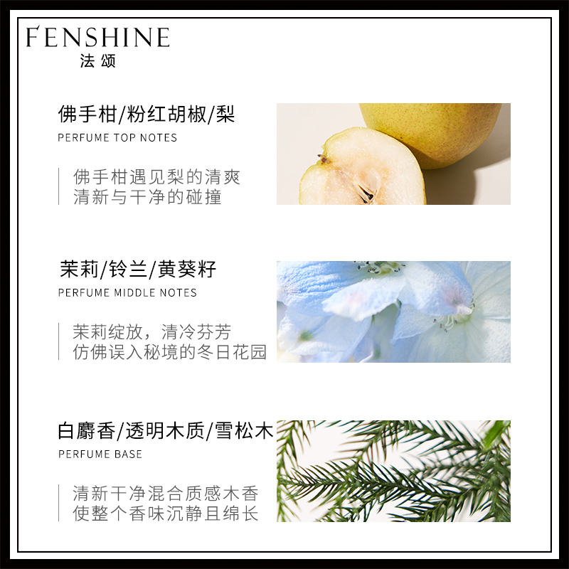 Женская парфюмерная вода от бренда FENSHINE, представляющая собой легкую, свежую и цветочно‑зеленую композицию, в которой сочетаются нотки прохлады, нежности белых цветов и мягкий теплый шлейф. Бренд предлагает ароматы в доступном сегменте с универсальным характером, ориентированные на повседневное использование и легкие, приятные впечатления без тяжелых интенсивных акцентов.