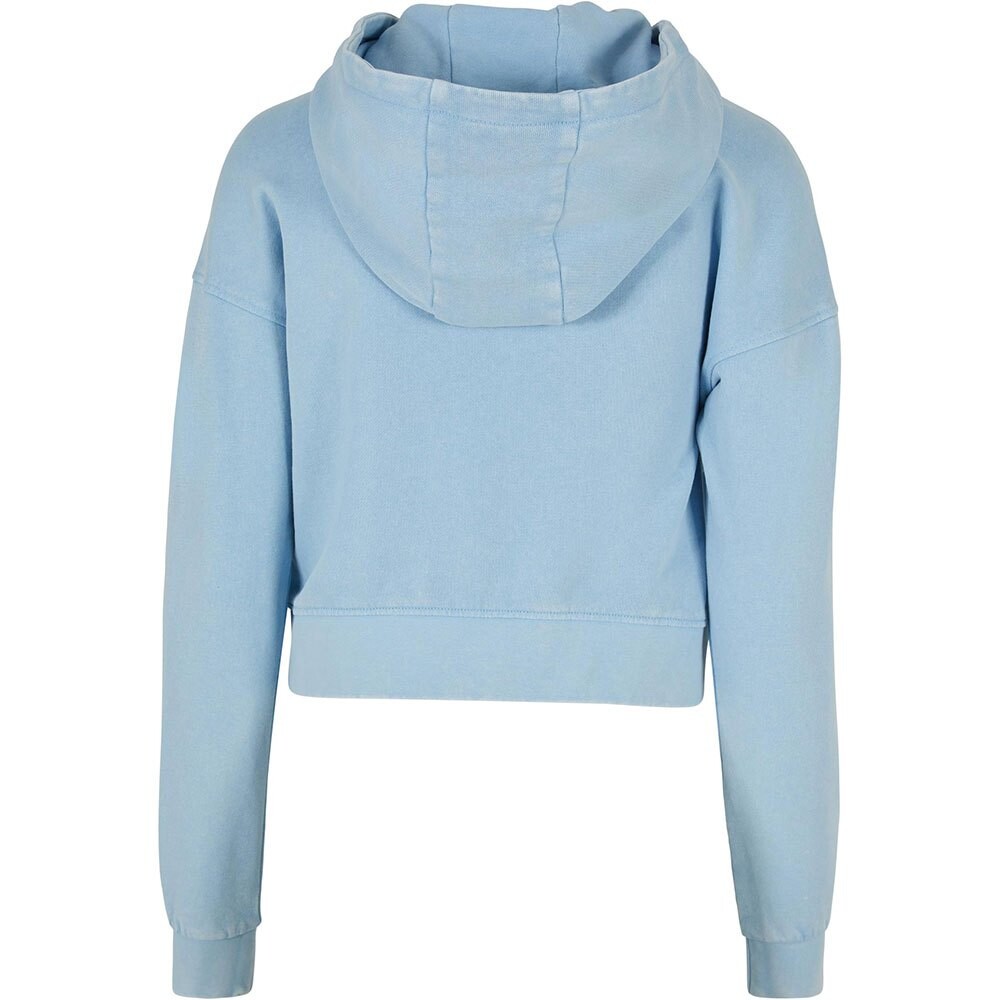 Толстовка имеет повседневный крой, заниженные плечи и коротко заканчивается на талии.