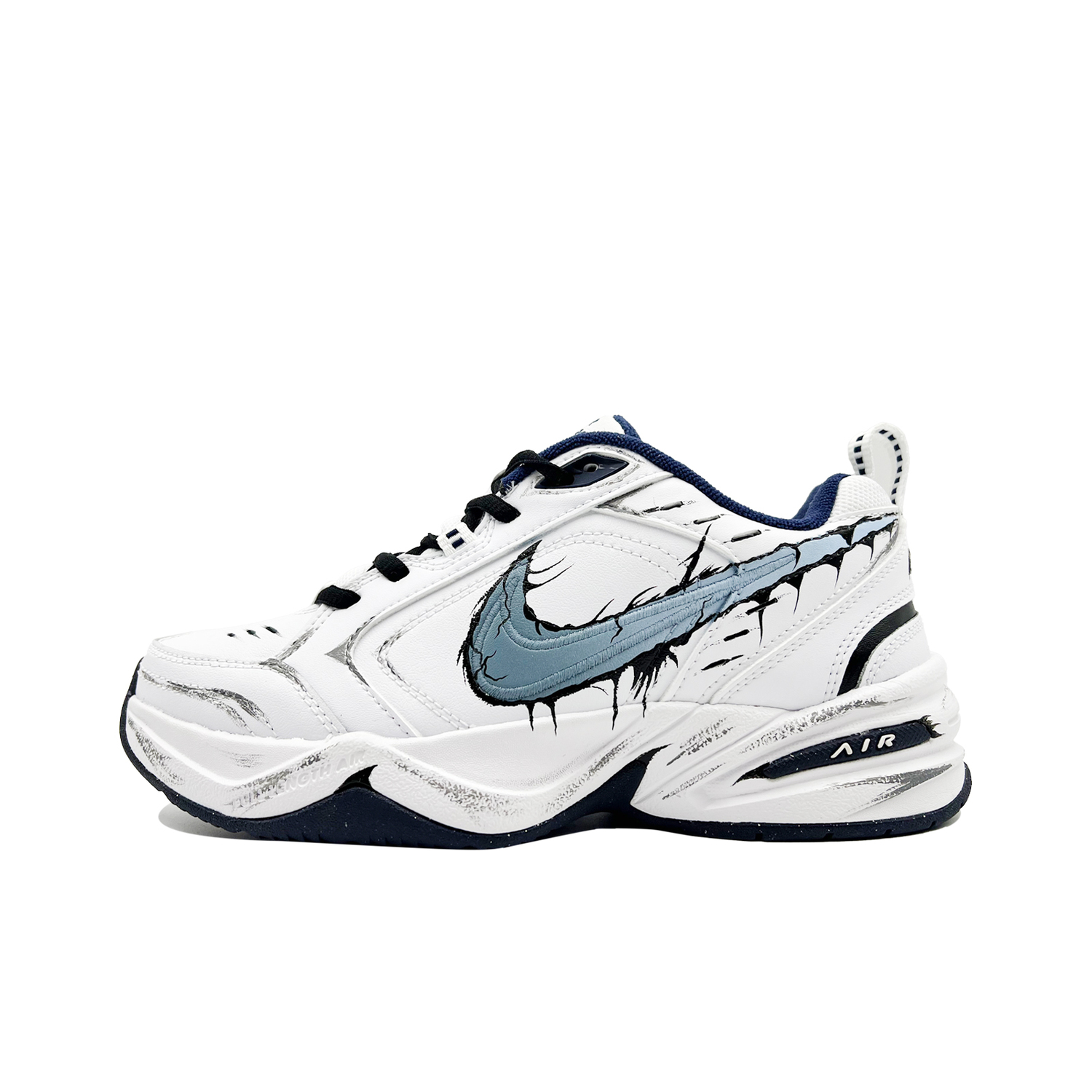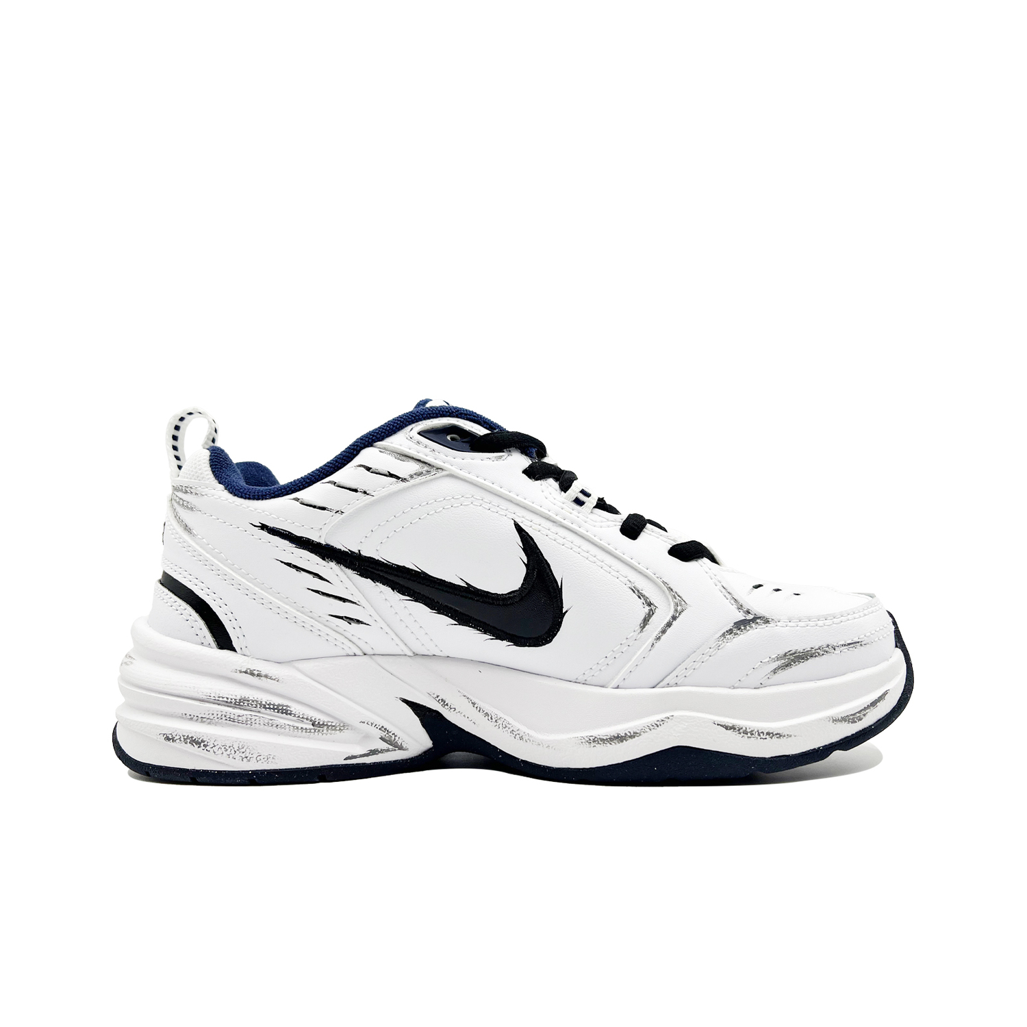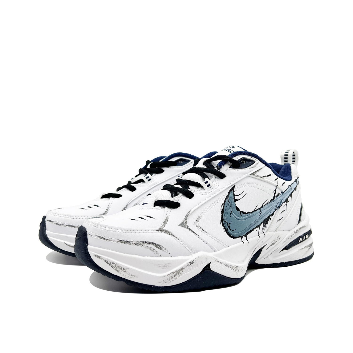 Эти кастомные кроссовки созданы на основе Nike Air Monarch 4. Для создания индивидуального дизайна используется процесс окрашивания и чистки, вдохновленный взрывной и агрессивной эстетикой переплетенного белого, синего и черного.