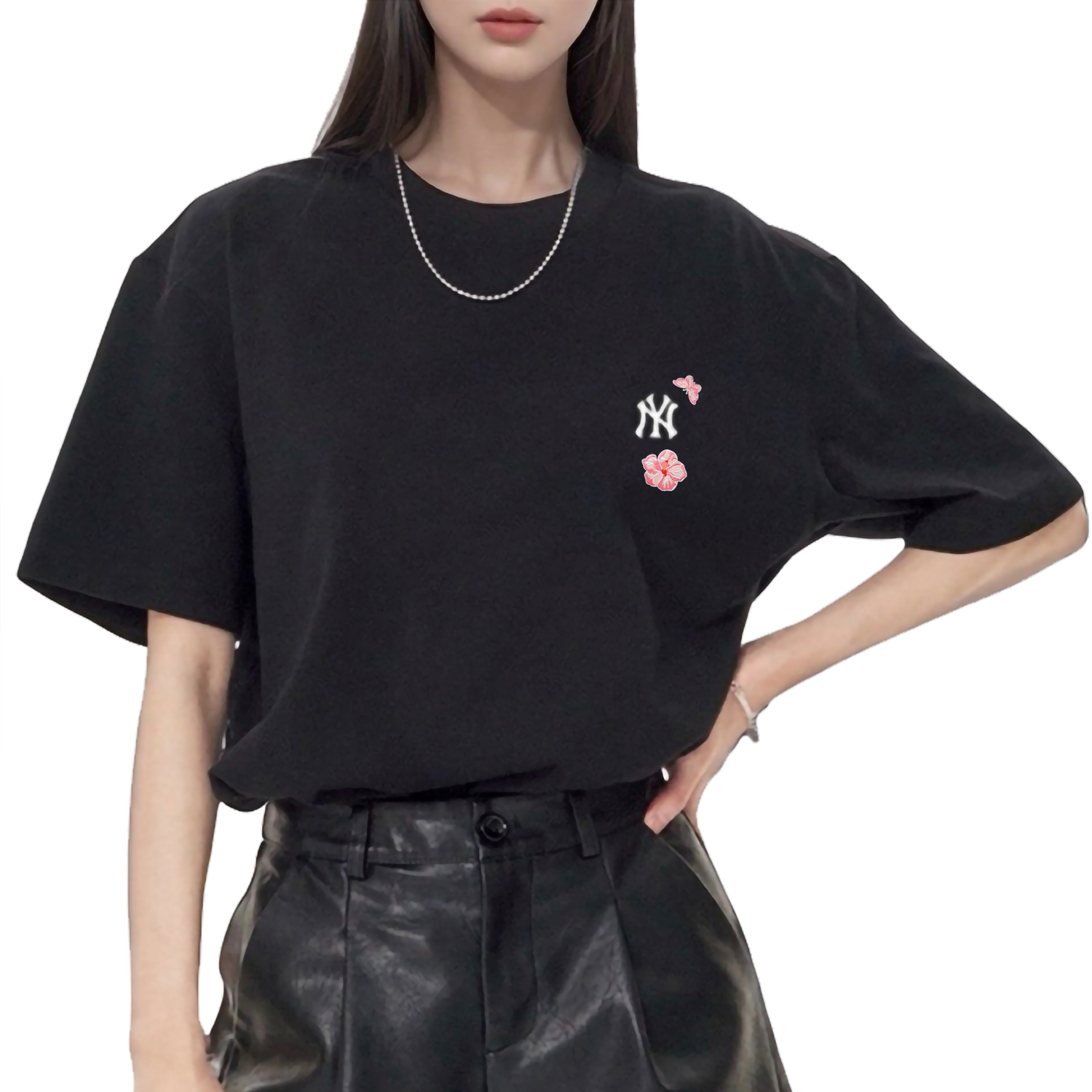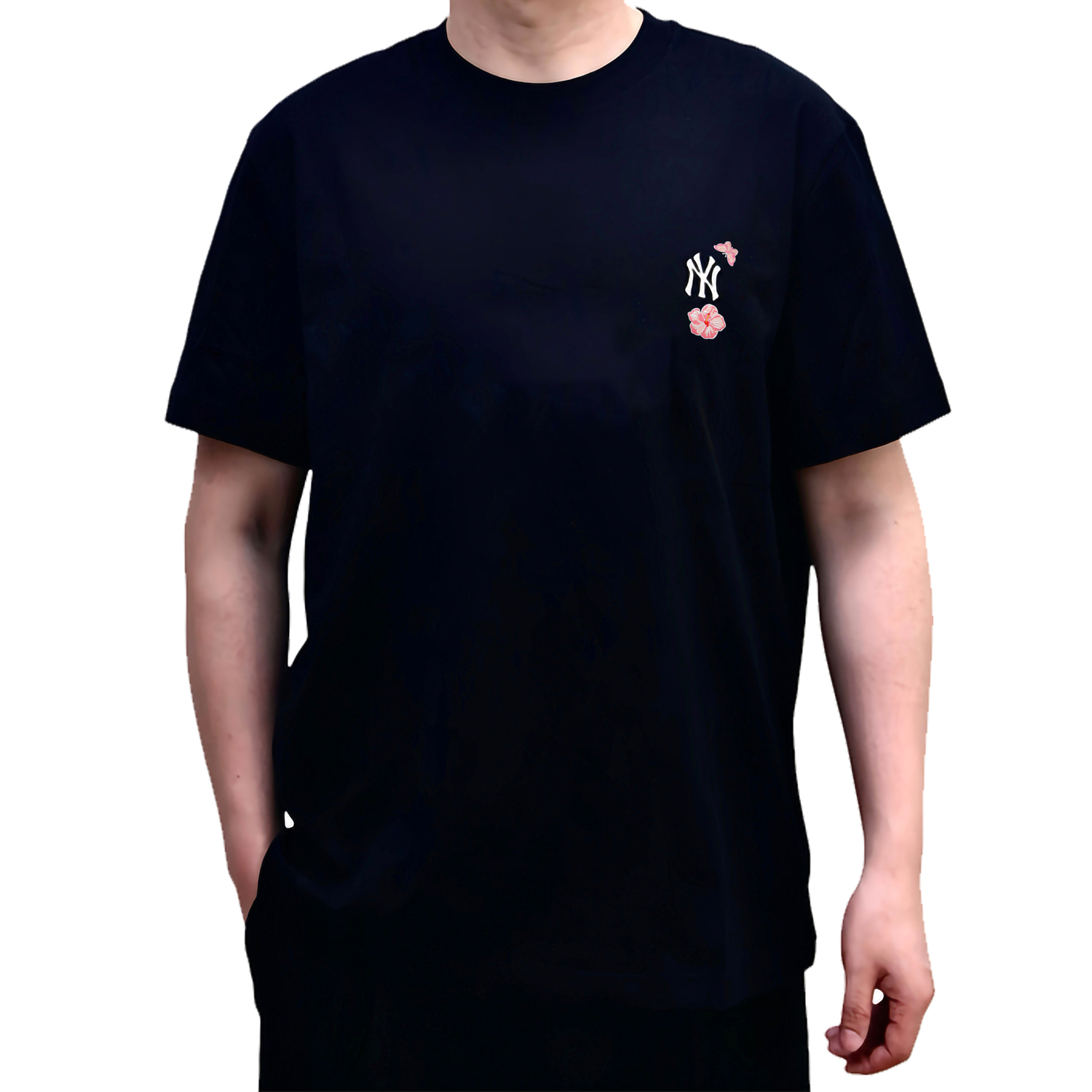 Этот индивидуальный дизайн основан на оригинальной однотонной универсальной футболке с короткими рукавами с мелким логотипом MLB New York Yankees SS25, повседневная и модная спортивная футболка унисекс. Вдохновением для модели послужил весенний сад, где цветы гибискуса и бабочки переплетаются, создавая яркую картину.