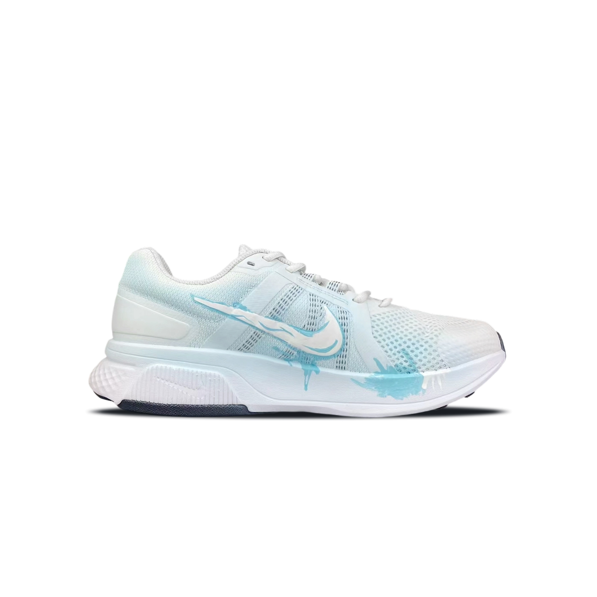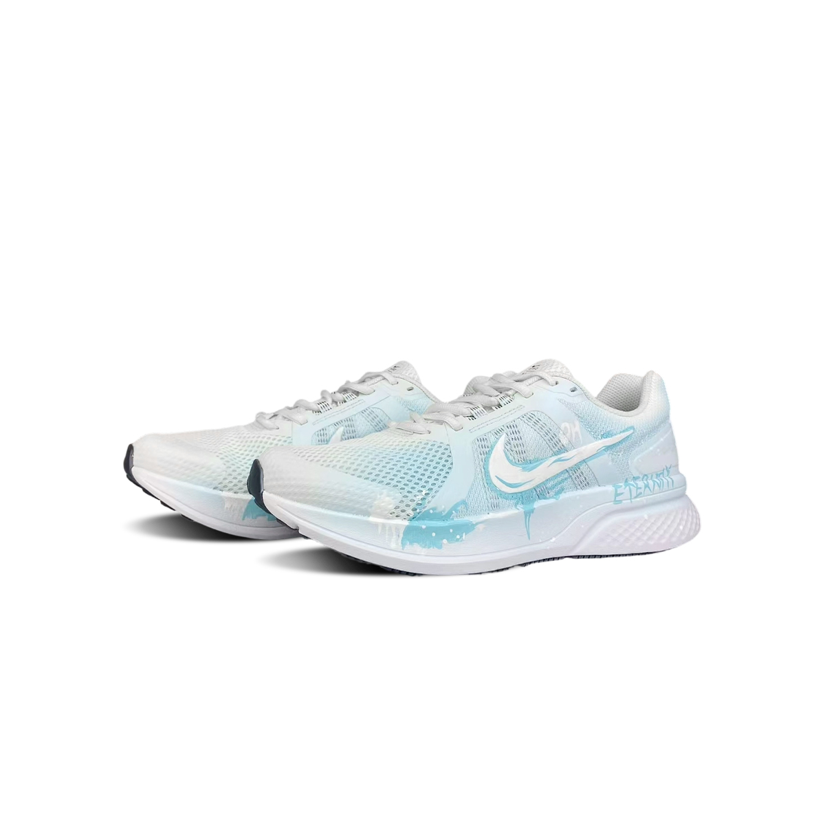 Эти кастомные кроссовки созданы на основе мужских белых кроссовок Nike Run Swift 2 с низким верхом (артикул CU3517-101) с белоснежной подошвой и голубыми чернильными вкраплениями, напоминающими о течении времени. Слово «ВЕЧНОСТЬ» (ETERNITY) перекликается с этой темой. Они сочетают в себе спортивные технологии и абстрактное искусство, превращая каждый шаг в исследование вечности, открывая безграничные возможности бега и наделяя кроссовки духовной основой, которая выходит за рамки простой функциональности.