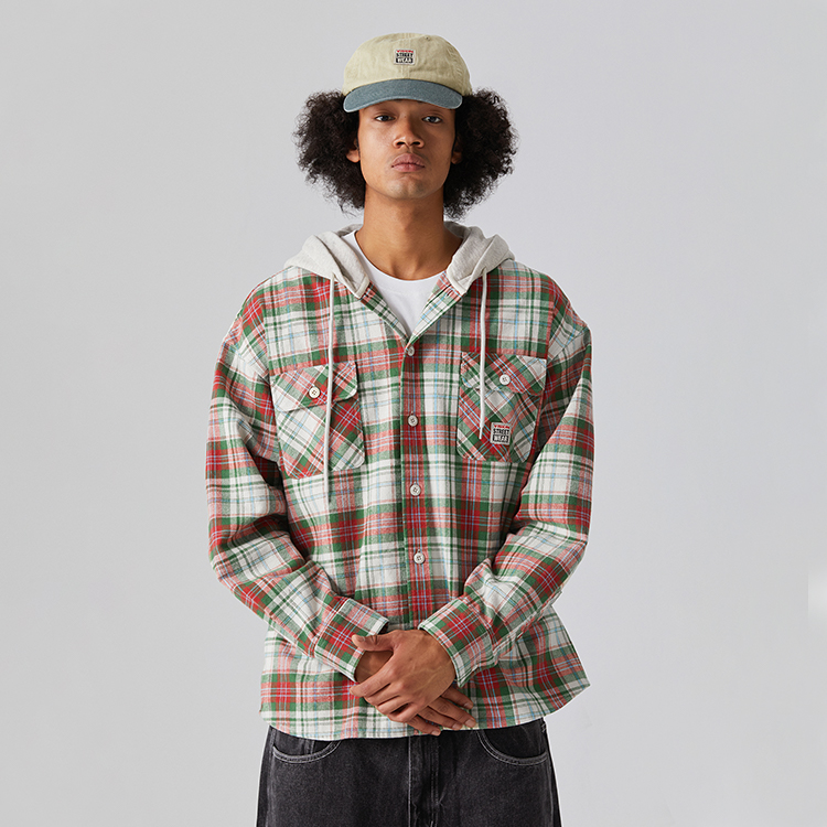 Эта рубашка с капюшоном свободного кроя выполнена из уникальной клетчатой ткани, сотканной из пряжи разных цветов. Ткань имеет начес для мягкости и комфорта. Два накладных кармана на груди украшены многослойным косым клетчатым узором. Капюшон выполнен из саржевого махрового полотна, гармонирующего с клетчатым узором рубашки, обеспечивая мягкость, комфорт, плотность и высокое качество. Капюшон затягивается хлопковым шнурком и имеет прозрачный тюрбан для простого и элегантного образа. Спинка рубашки украшена сборками для улучшения ее общей застежки, а закругленный подол добавляет объем. На левом переднем кармане находится тканый логотип Box.