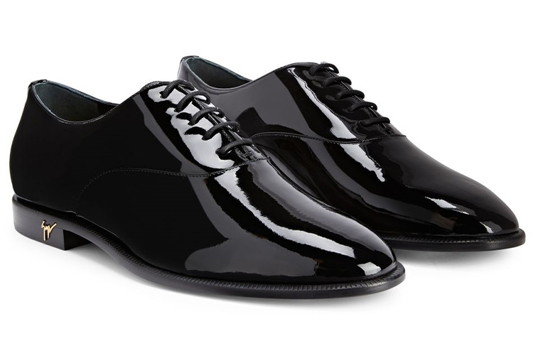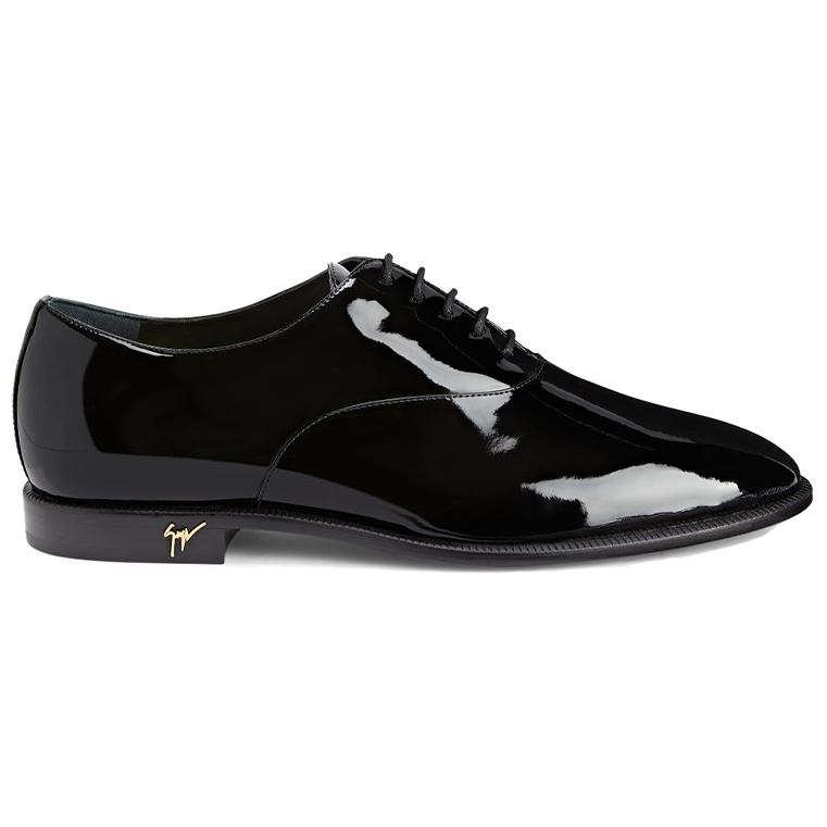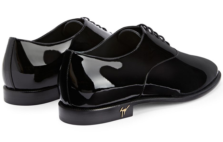 Туфли-оксфорды на шнуровке, изготовленные из черной синтетической ткани с эффектом лакированной кожи и соответствующими шнурками, с кожаной подкладкой и подошвой, с золотистой металлической фурнитурой «Signature» сзади на пятке.