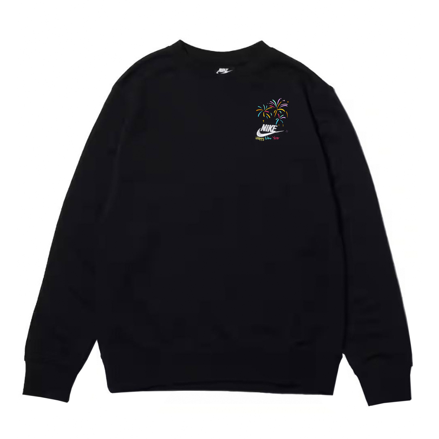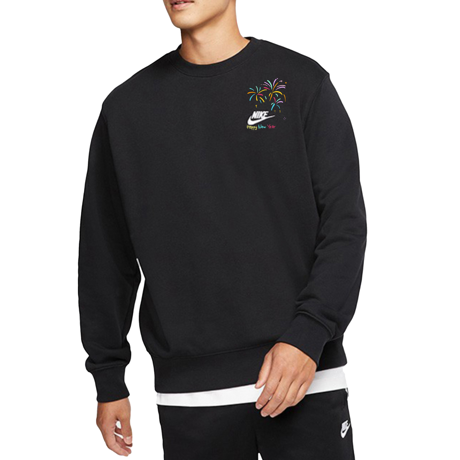 Эта модель, разработанная на заказ, основана на оригинальной мужской повседневной толстовке с длинными рукавами и круглым вырезом с логотипом Nike, весенний стиль, черный. Эта парная толстовка, выполненная в новогодней тематике, украшена ярким фейерверком, который мгновенно оживляет черный наряд!