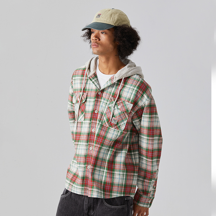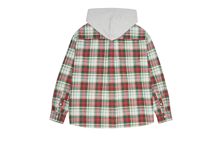 Эта рубашка с капюшоном свободного кроя выполнена из уникальной клетчатой ткани, сотканной из пряжи разных цветов. Ткань имеет начес для мягкости и комфорта. Два накладных кармана на груди украшены многослойным косым клетчатым узором. Капюшон выполнен из саржевого махрового полотна, гармонирующего с клетчатым узором рубашки, обеспечивая мягкость, комфорт, плотность и высокое качество. Капюшон затягивается хлопковым шнурком и имеет прозрачный тюрбан для простого и элегантного образа. Спинка рубашки украшена сборками для улучшения ее общей застежки, а закругленный подол добавляет объем. На левом переднем кармане находится тканый логотип Box.