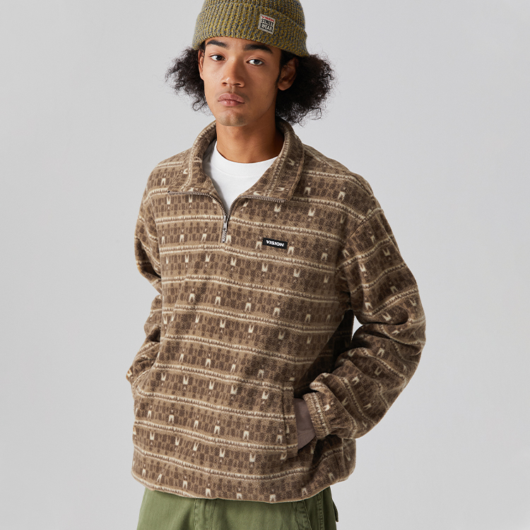 Классический свитшот VISION с воротником-стойкой, полустойкой и эластичными манжетами. Ткань - специально сотканный флис с принтом по всей поверхности из исторической библиотеки изображений VISION в ретро-цветовой гамме. На левой стороне груди расположена длинная тканая этикетка VISION, а на нижнем правом подгибе спинки - тканая этикетка с логотипом бренда Box. Два передних кармана и кулиски с обеих сторон подола с внутренним усилением для предотвращения разрывов.
