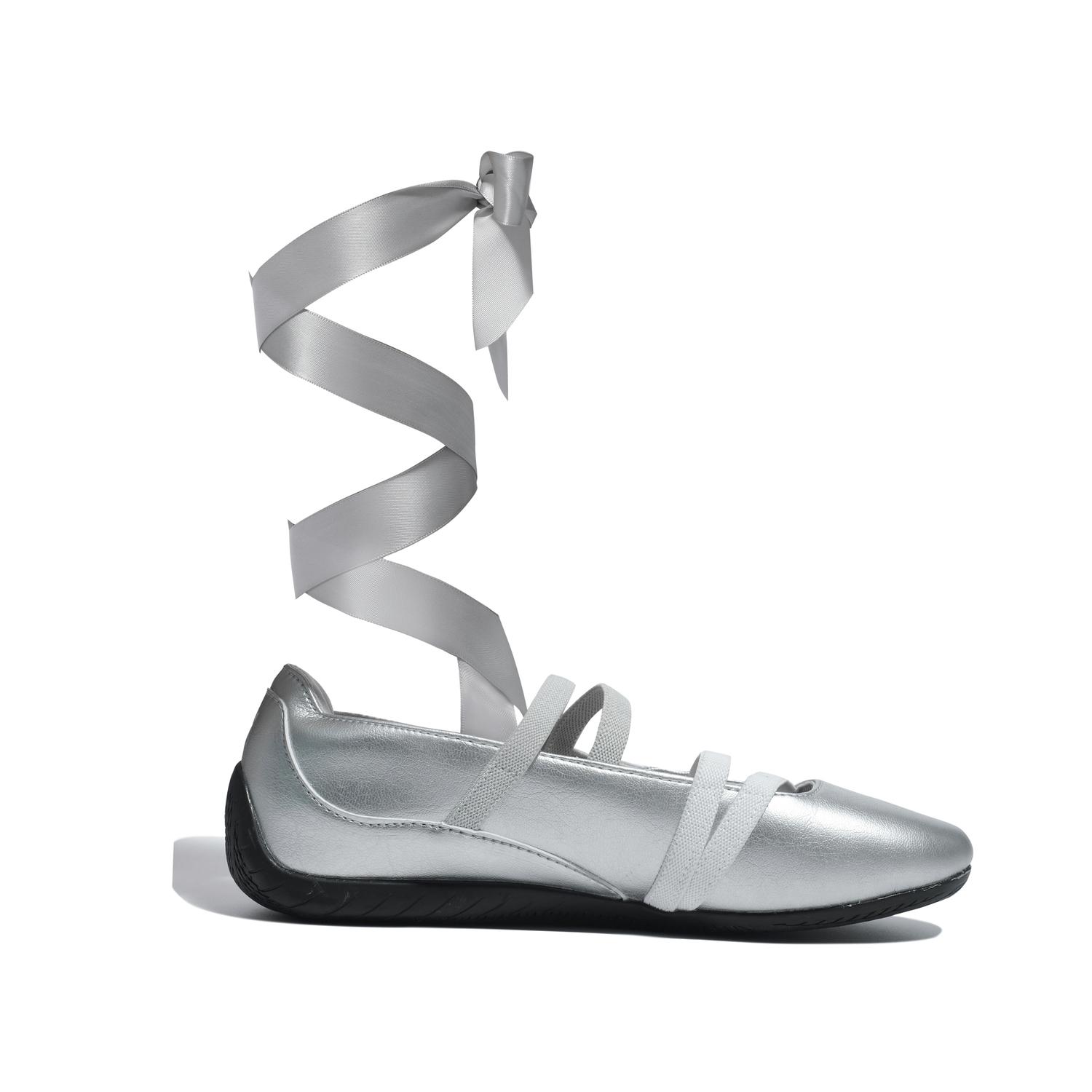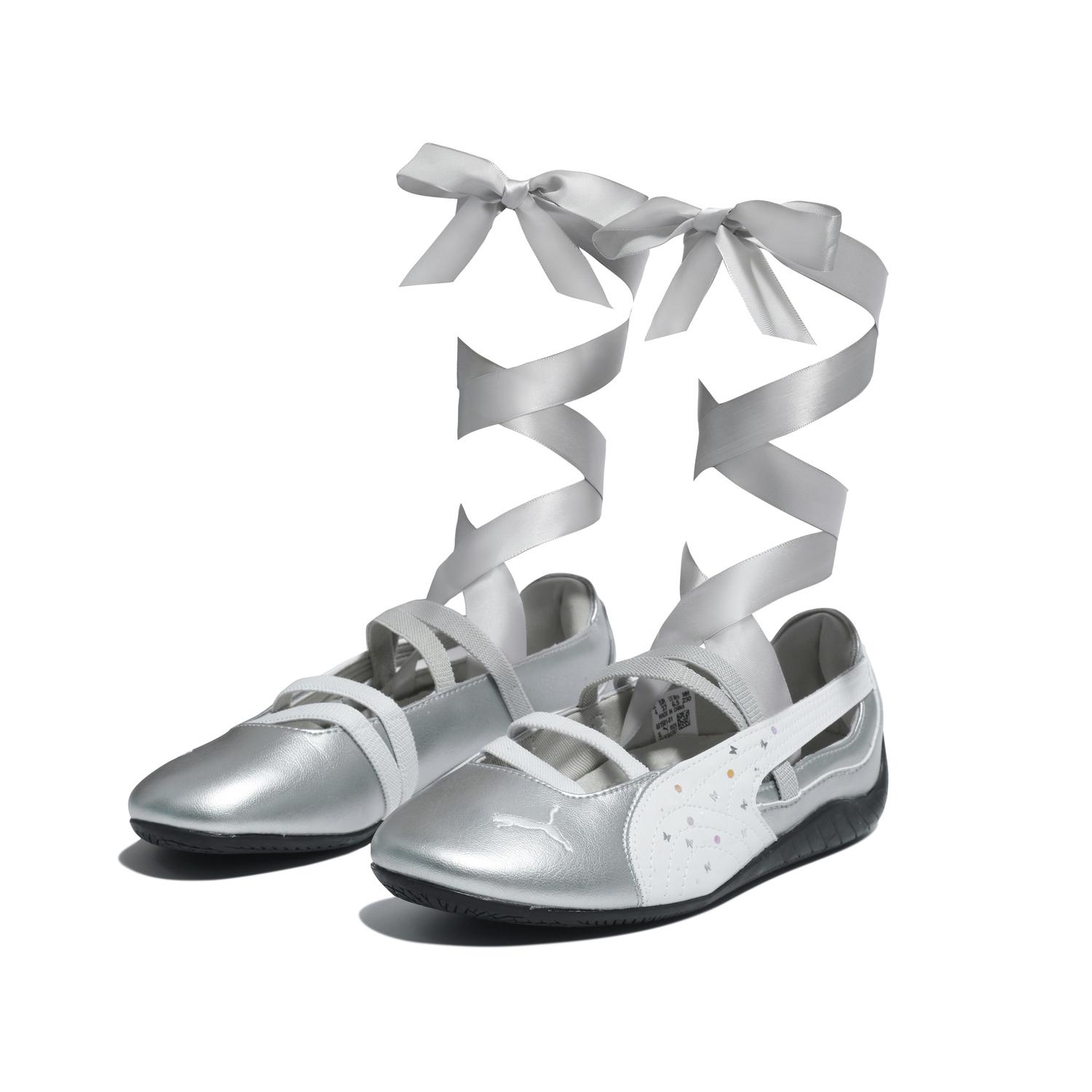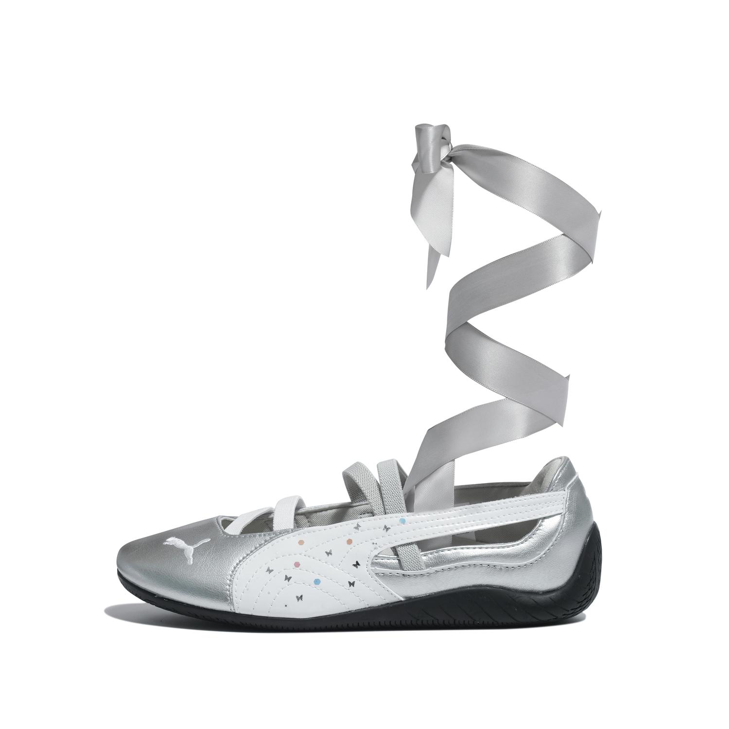 Эти кроссовки изготовлены на заказ на основе оригинальных балеток PUMA Speedcat Ballet на тонкой подошве. Это удобные, универсальные, плоские, нескользящие, износостойкие, повседневные туфли с низким верхом для женщин серебристо-белого цвета с артикулом 401581-01.