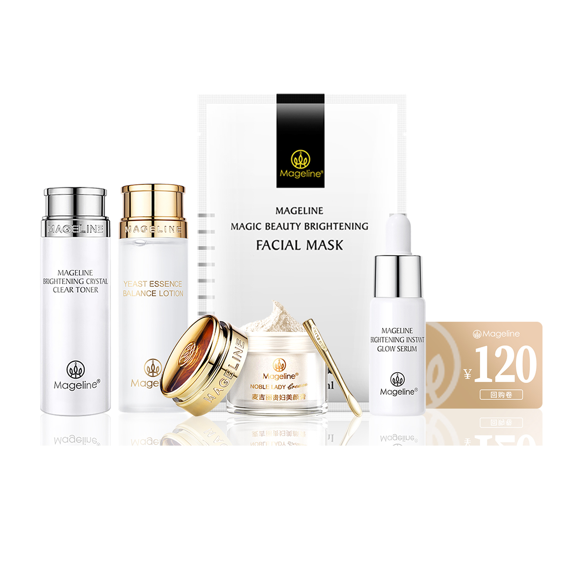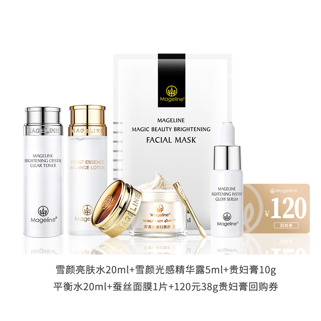 В набор входит: 10 г роскошного крема + 20 мл балансирующего тоника + 20 мл осветляющего лосьона + 5 мл осветляющей эссенции + 1 шелковая маска + купон на повторную покупку на 120 юаней