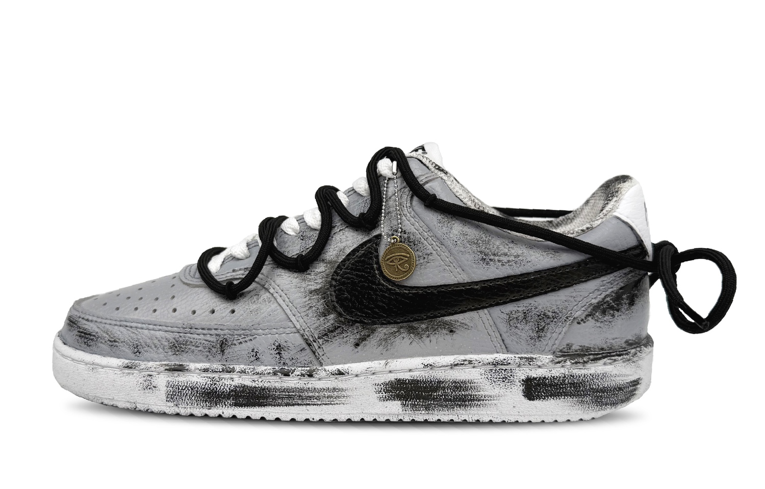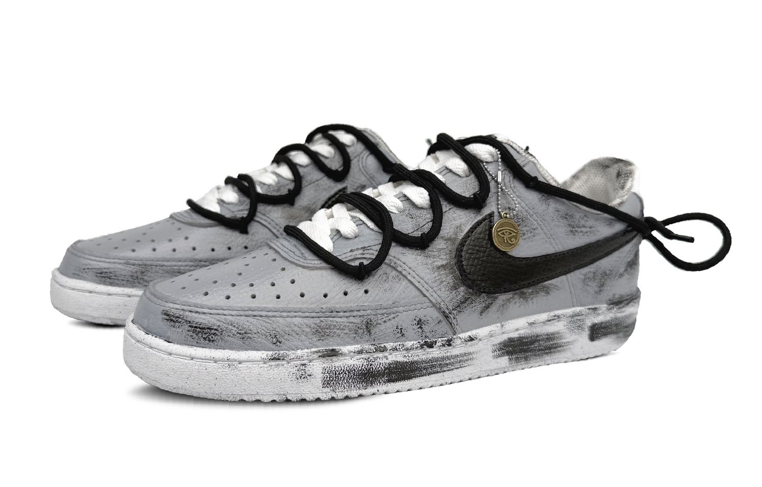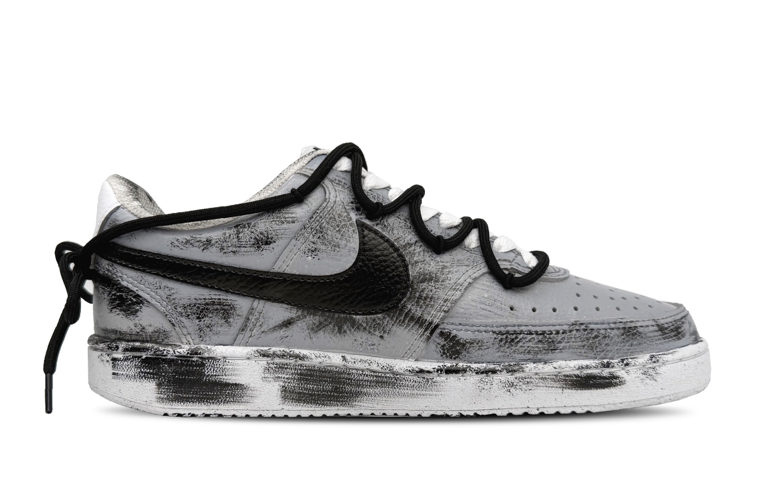 Эти кастомные кроссовки основаны на оригинальной модели Nike Court Vision 1. Общая цветовая гамма преимущественно серо-черная, с элементами брызг краски на сером верхе. Этот продуманный дизайн подчеркивает искреннюю, нестандартную и сдержанно элегантную индивидуальность. Подходят для любого сезона.