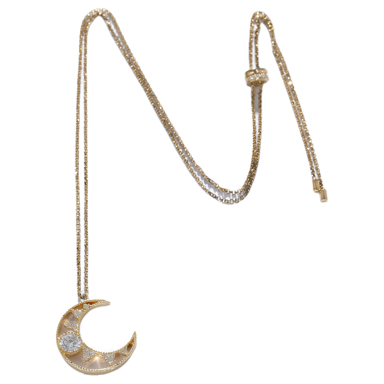Добавьте в свой образ нотку современности с этим ожерельем в форме луны. Оно украшено белыми камнями и станет изысканным дополнением к вашему вечернему наряду.