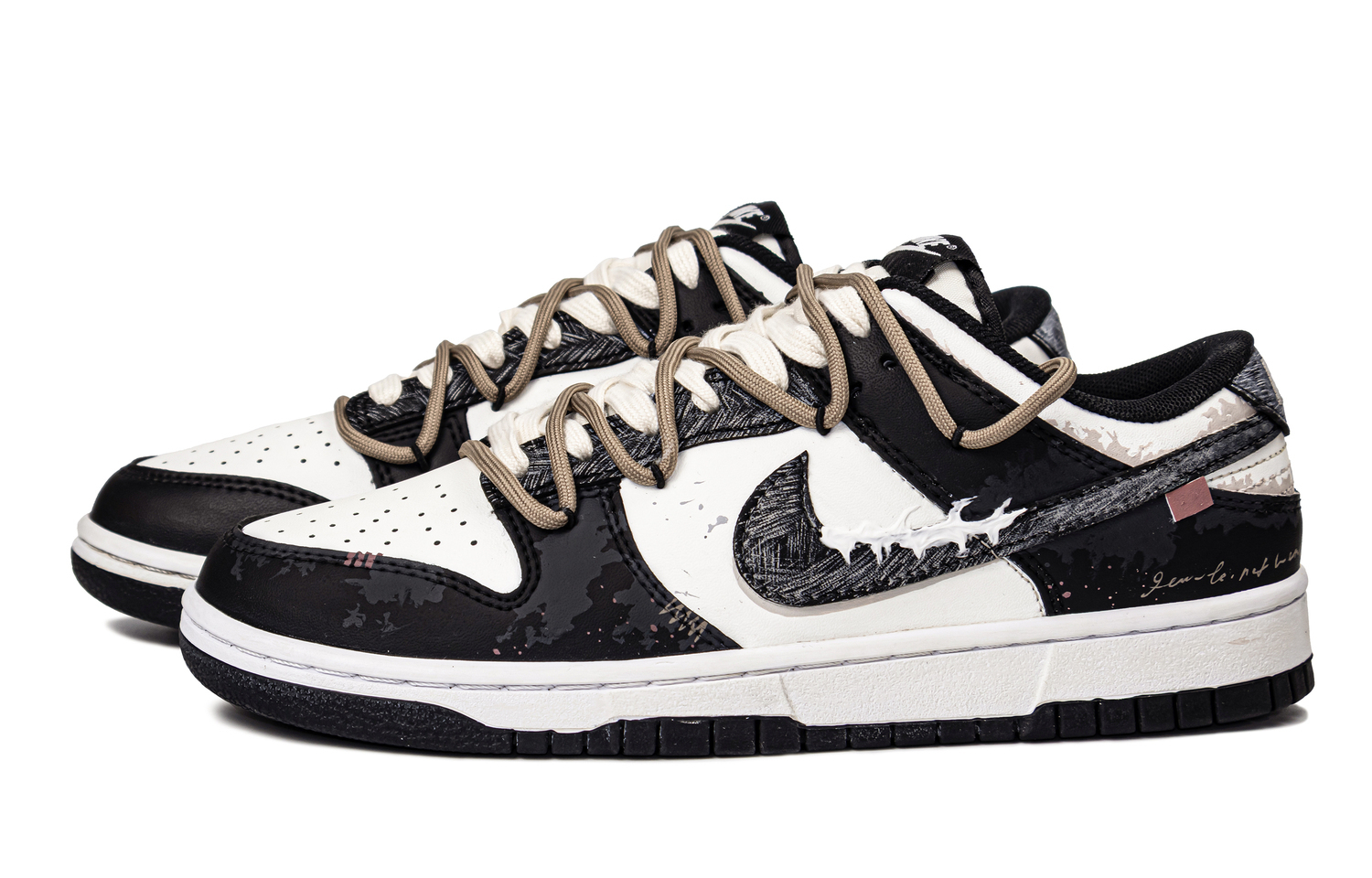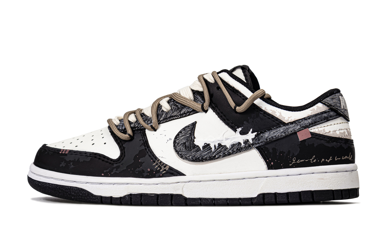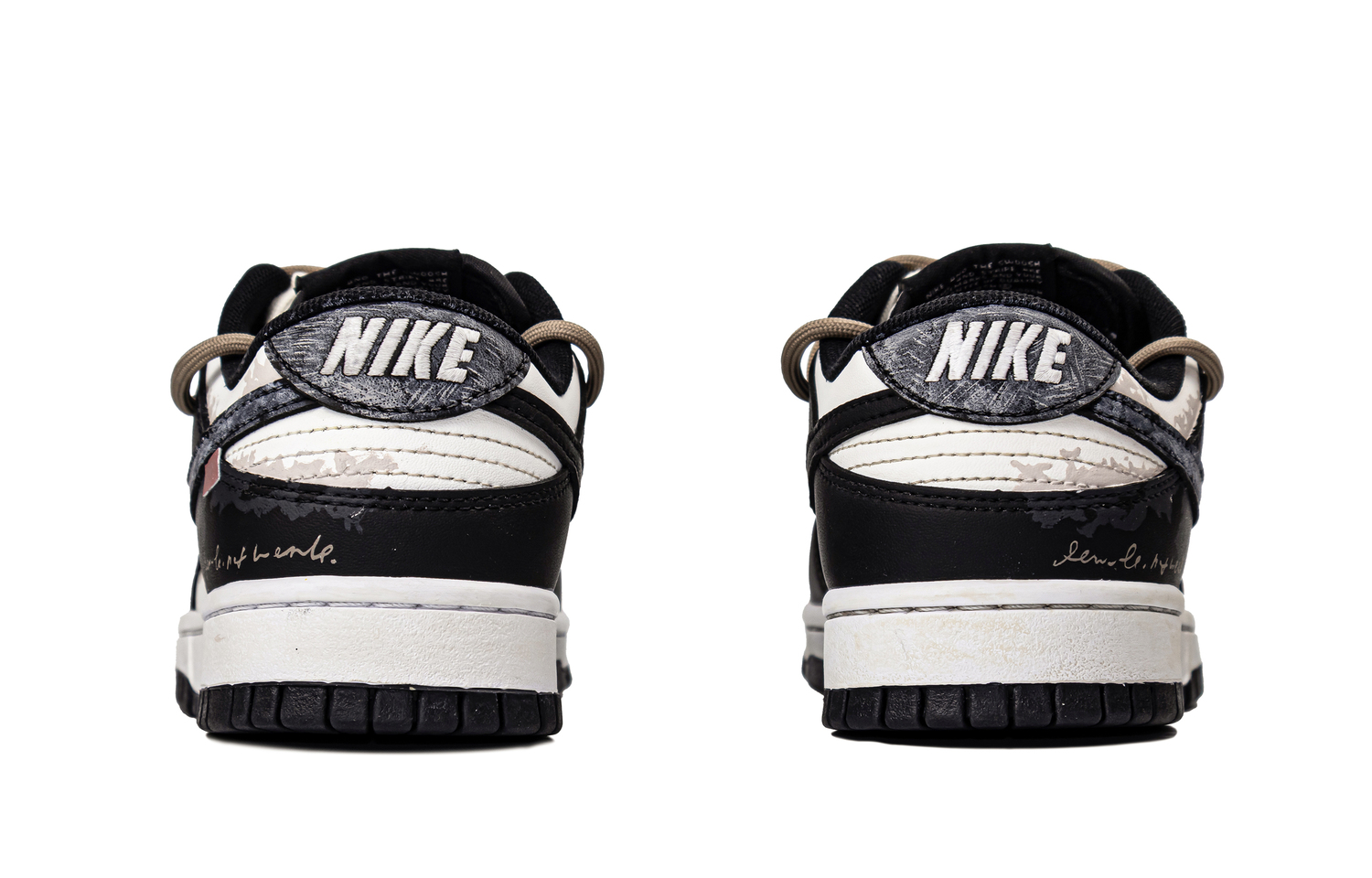 Эти кастомные кроссовки основаны на модели Nike Dunk унисекс. Дизайн вдохновлен эстетикой потертостей и теплотой расписанных вручную деталей. Белые участки обработаны состаренным покрытием, создающим «окисленно-бежевый» оттенок, имитирующий износ за годы использования; текстура с брызгами краски на носке и боковинах имитирует обветренную стену.