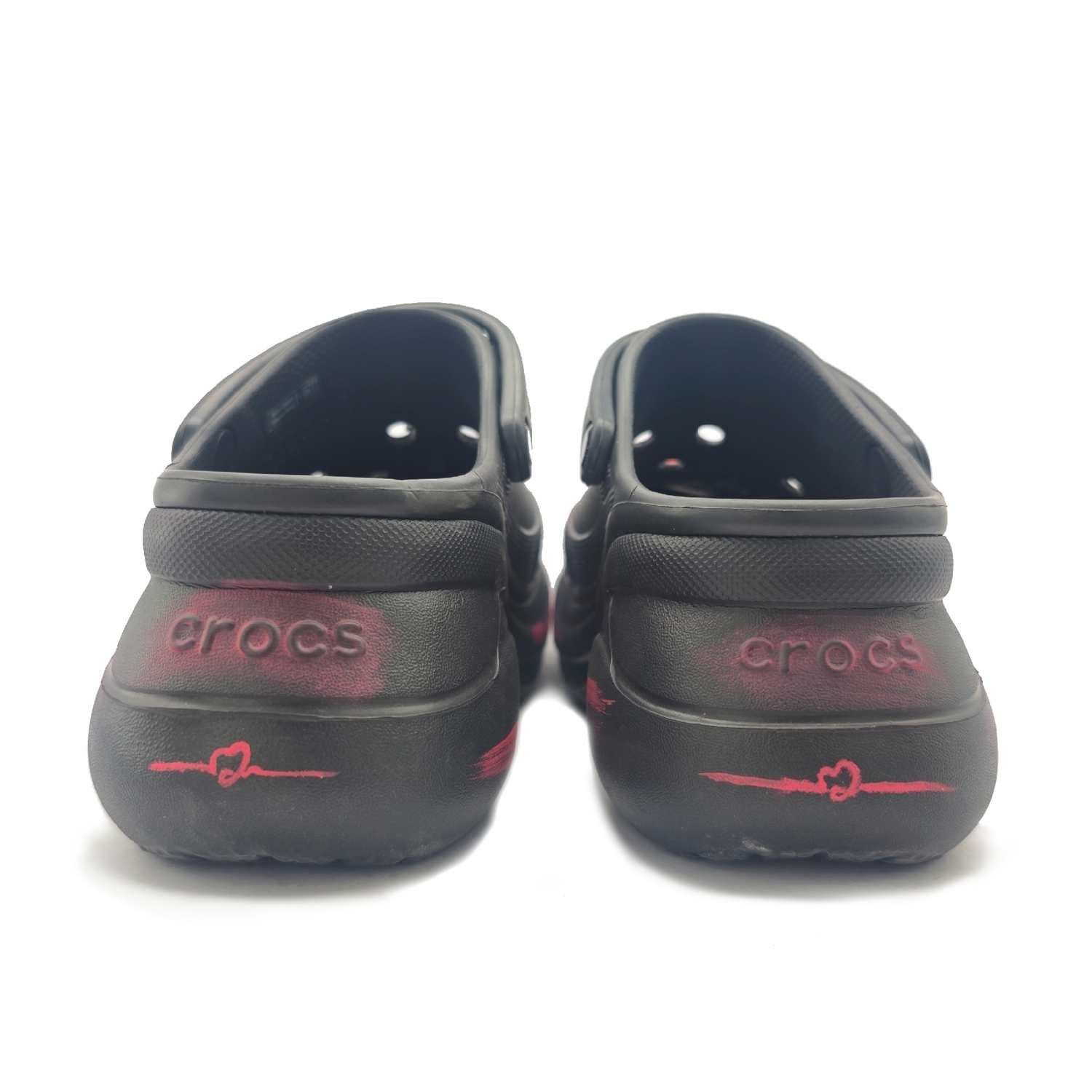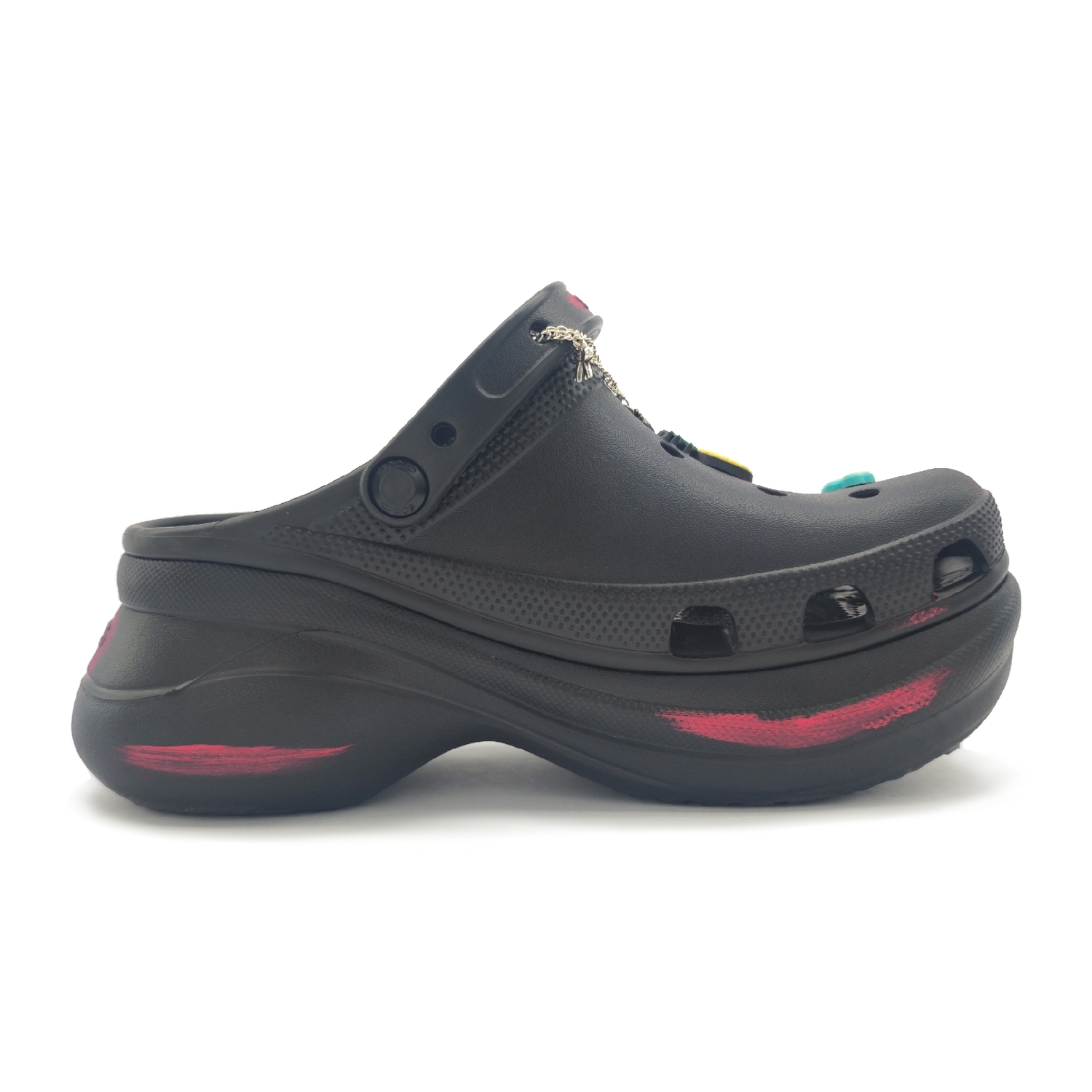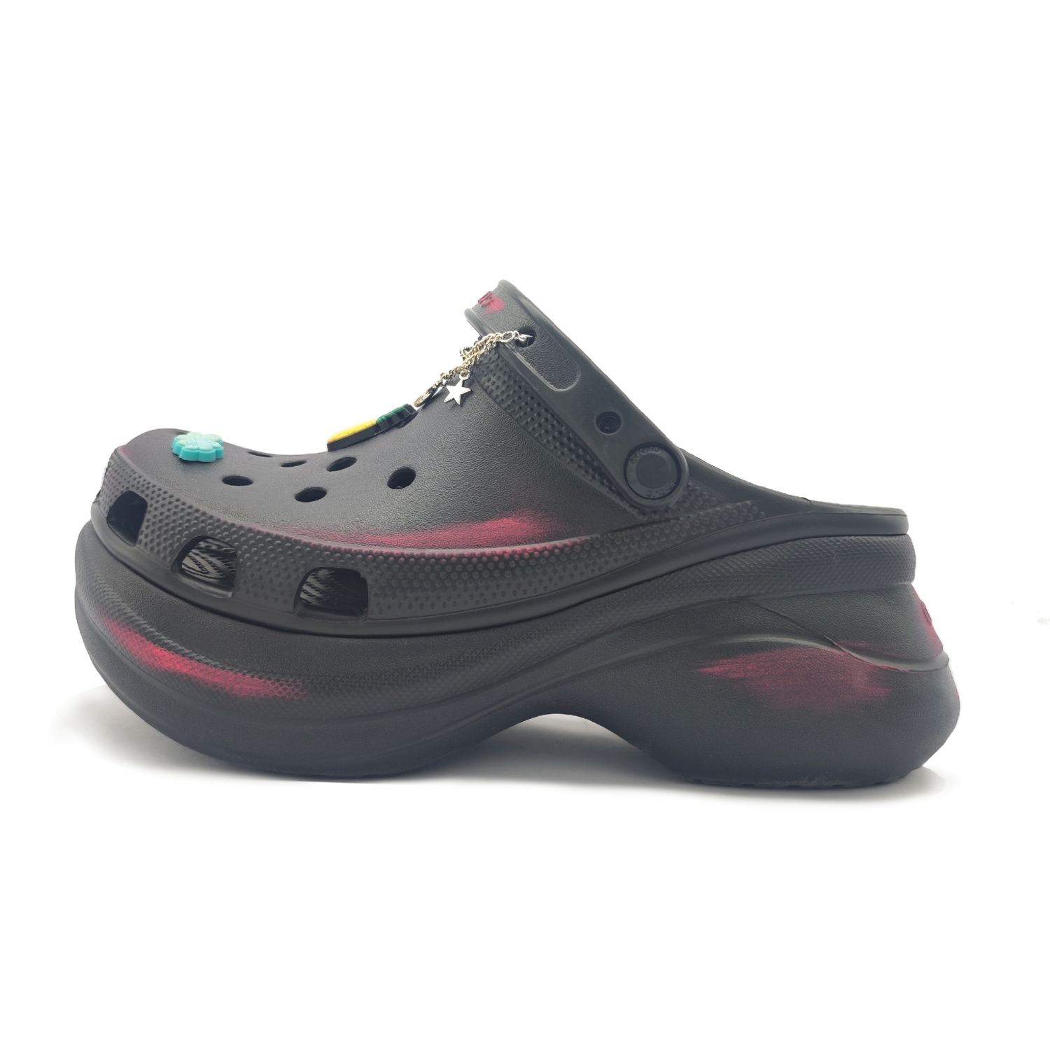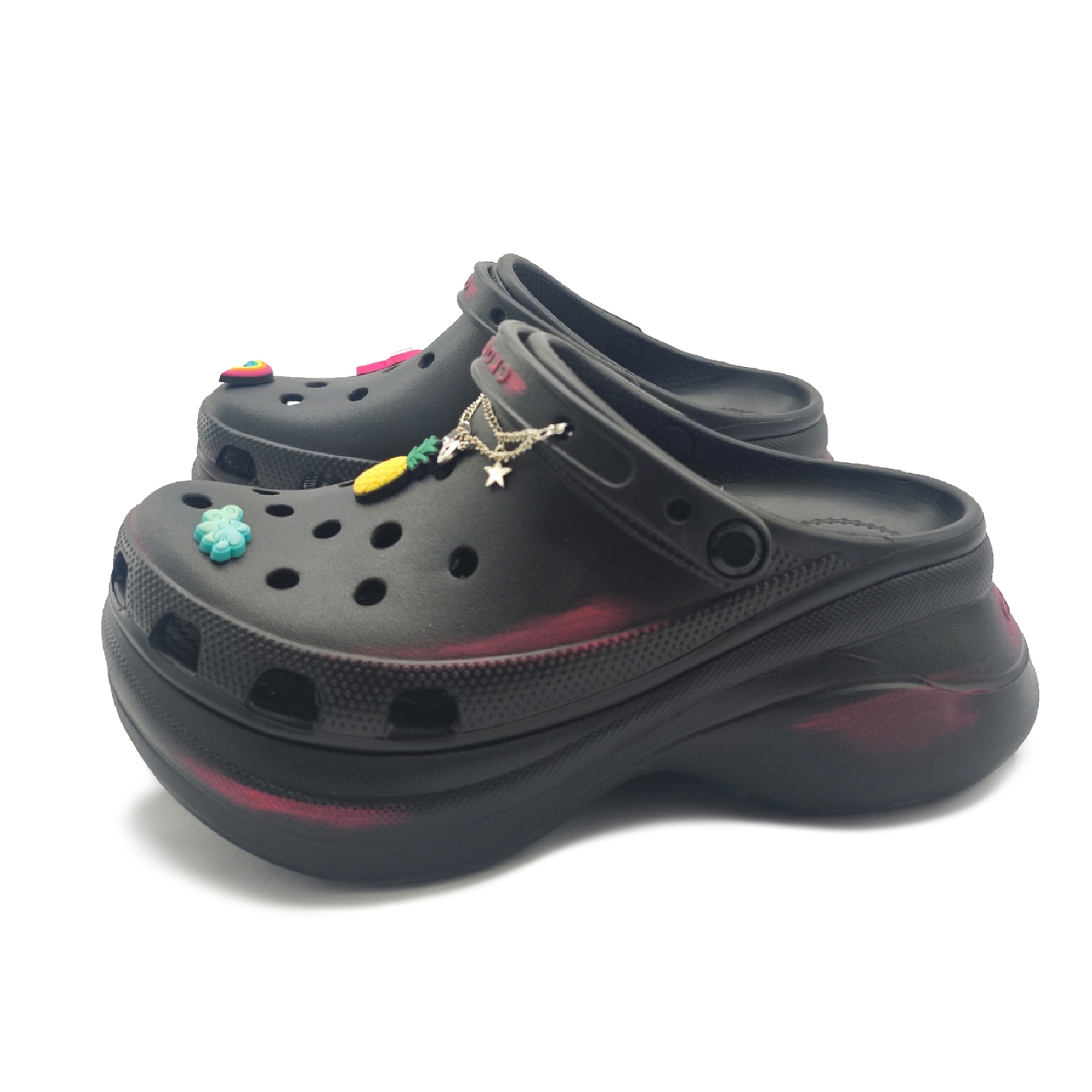 Comfort First: Легкий, мягкий и высокоэластичный материал EVA эффективно снижает нагрузку на стопу и усталость даже при длительном ношении. Перфорированный дизайн в верхней части способствует циркуляции воздуха, помогая рассеивать тепло и сохранять ноги сухими и комфортными, предотвращая заложенность носка даже в жаркую погоду. Эргономичная посадка: эргономичная подошва соответствует изгибам стопы, обеспечивая комфортную поддержку и повышая устойчивость во время ходьбы. Стильная цветовая схема: черная основа с эффектами розовых и красных брызг нарушает монотонность сплошного цвета, добавляя визуальную глубину и артистизм, делая обувь более персонализированной и модной, удовлетворяя потребителей, ищущих уникальный стиль. Аксессуары: перфорация в верхней части позволяет вставлять различные украшения для обуви своими руками (например, синее украшение для обуви на картинке), а также обувь оснащена цепочками со звездами и другими узорами.