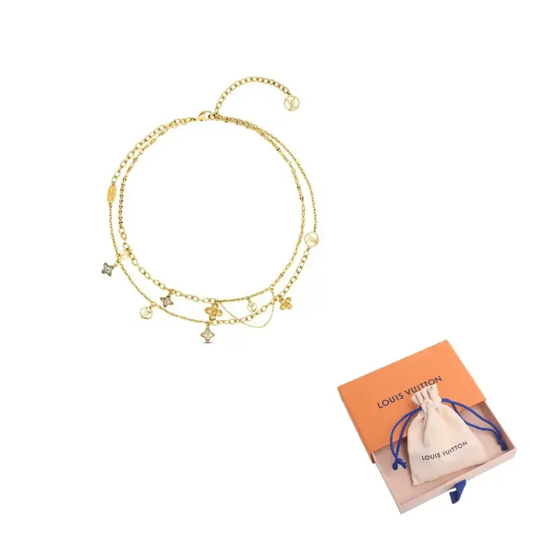 Колье Blooming Strass вдохновлено принтом на ткани Louis Vuitton: металлические цветы-монограммы и искусственные бриллианты подвешены на элегантных золотых цепочках. На регулируемой цепочке отпечатан логотип LV Circle, отражающий фирменный стиль бренда.