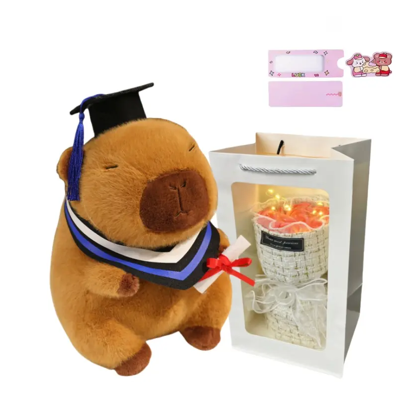 Название продукта: Выпускной Капибара-кун - синяя шляпа с кисточками + розовый букет личи + выдвижная поздравительная открытка с щенком