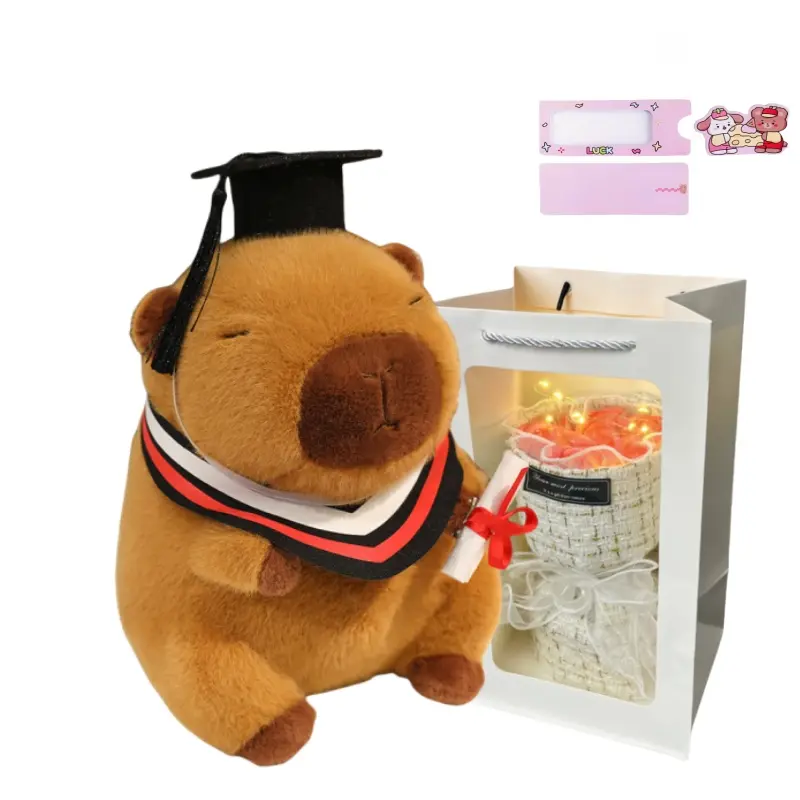 Название продукта: Выпускной Капибара-кун - черная кисточка на шляпе + розовый букет личи + поздравительная открытка с щенком