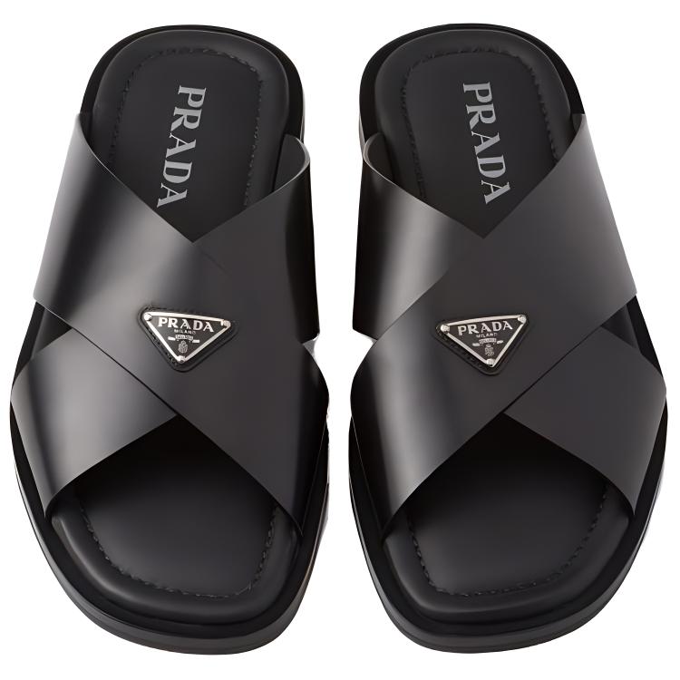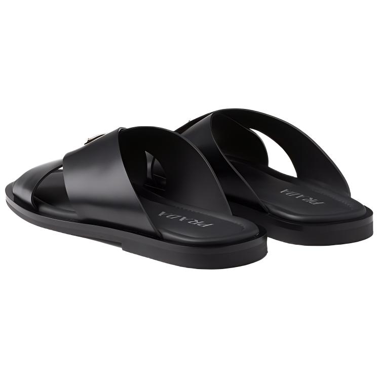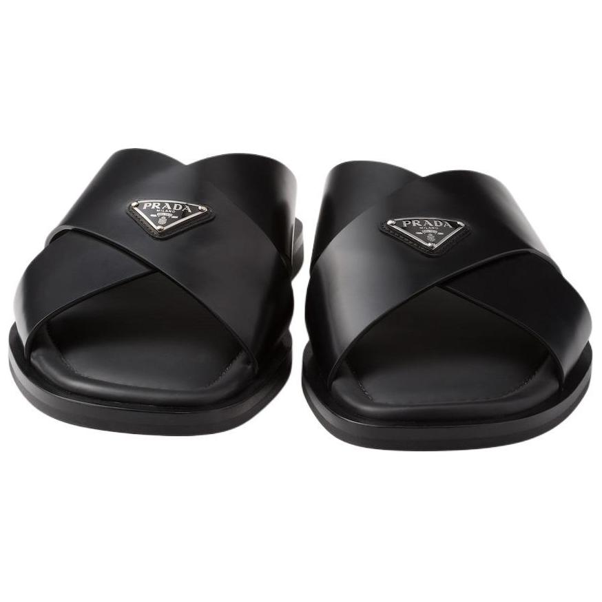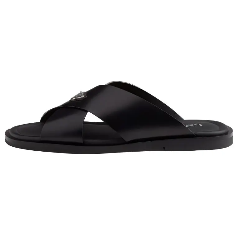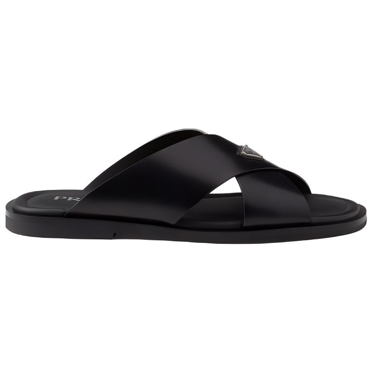 Эти перекрестные сандалии отличаются стильным дизайном, излучающим утонченную элегантность. Изготовленные из шлифованной кожи, классического материала для мужских туфель, эти сандалии представляют собой изысканную интерпретацию летней обуви. На верхней части модели красуется треугольный логотип из эмалированного металла, впервые появившийся на чемоданах Mario Prada в 1913 году.