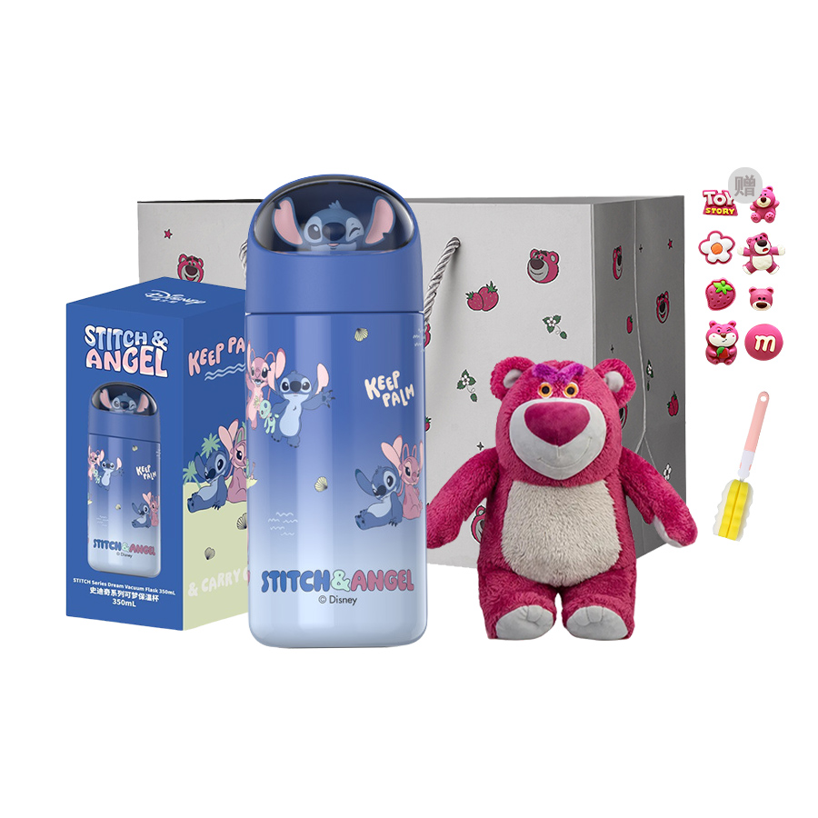 Стиль: термокружка Stitch Blue Direct + сумка для покупок + большая кукла (в комплекте щетка для мытья посуды + наклейки)