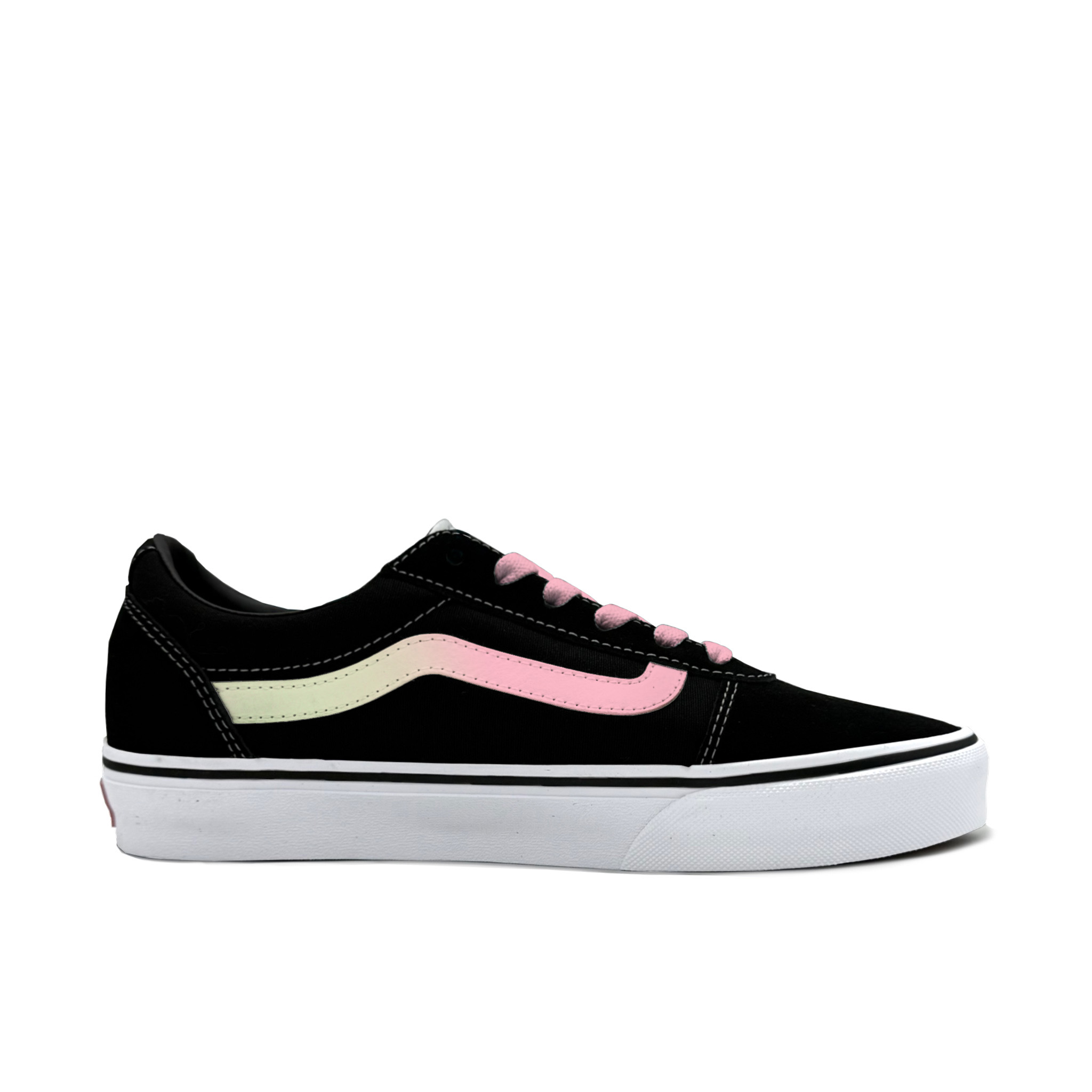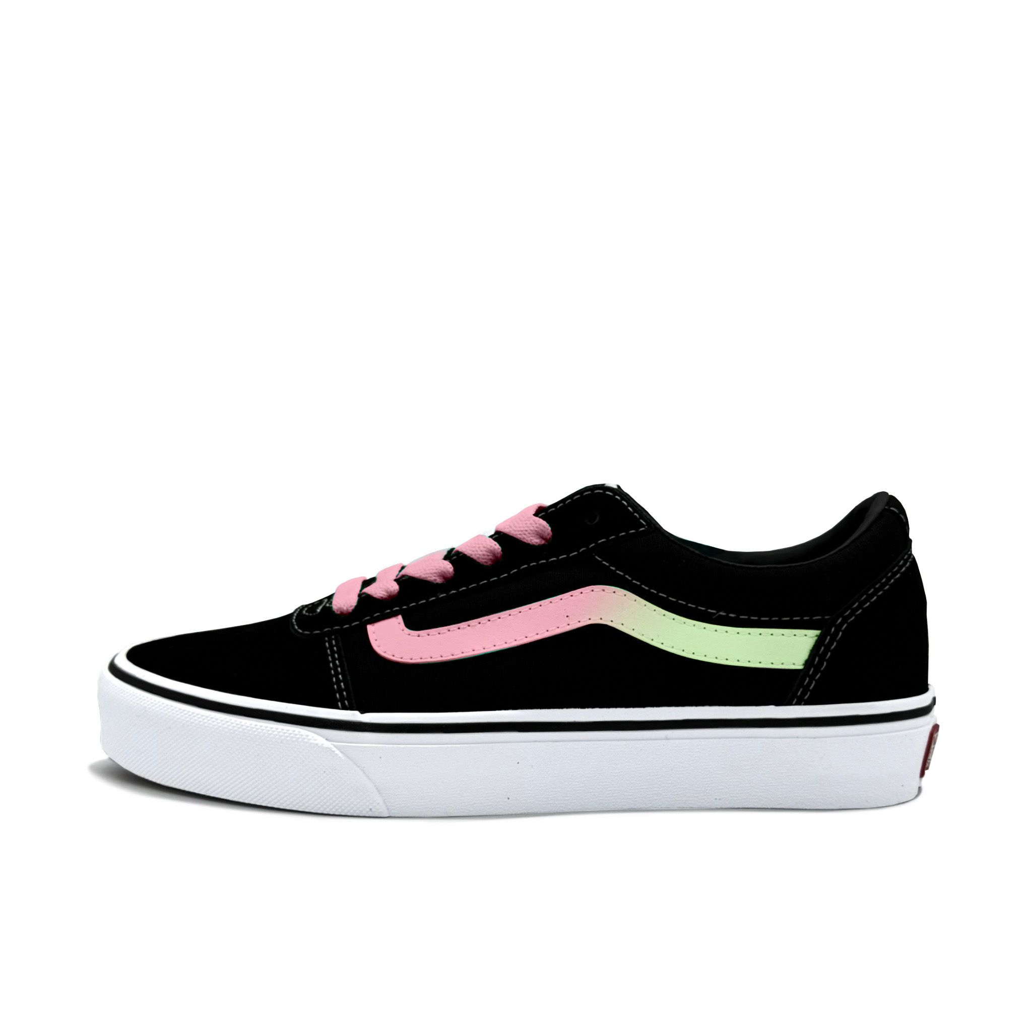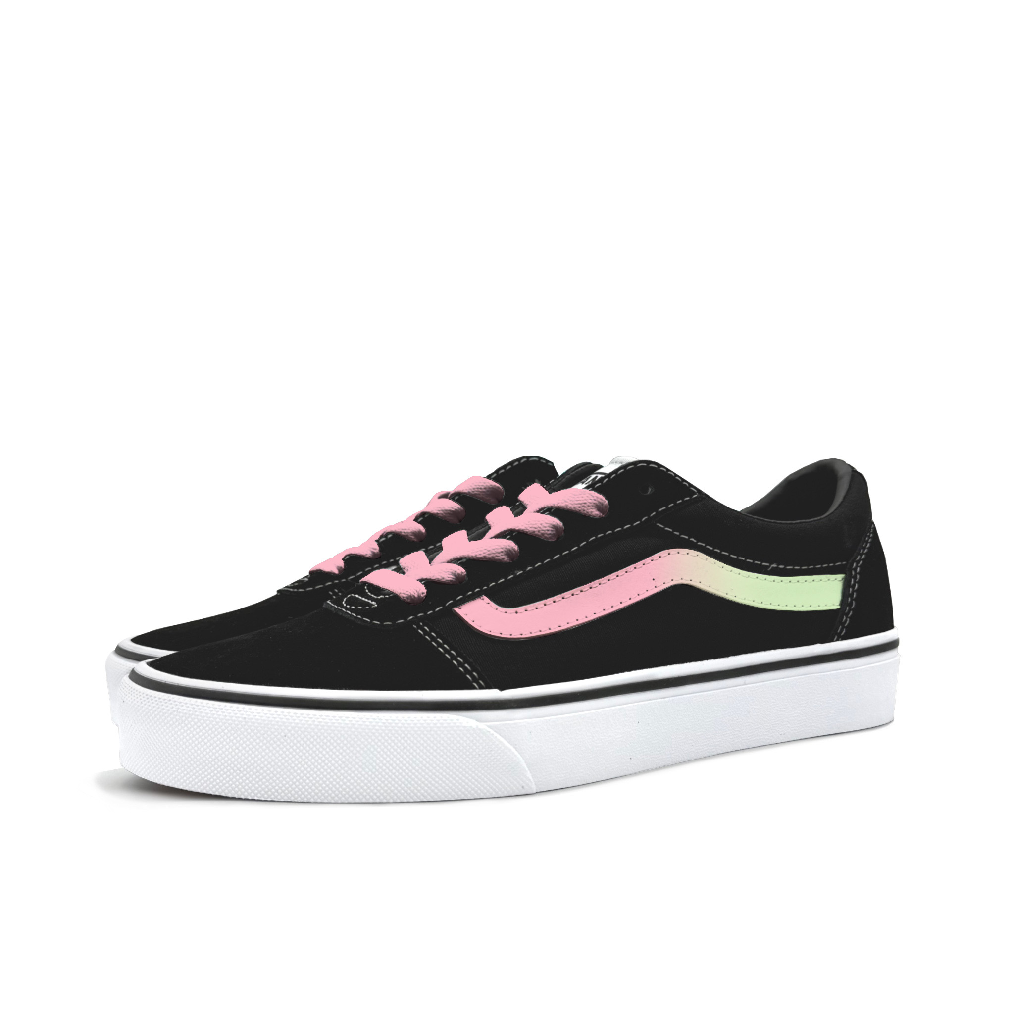 Эти кастомные кроссовки созданы на основе оригинальных Vans Ward Active, удобных и универсальных низких кроссовок унисекс в черно-белой гамме. В основе дизайна лежит черный цвет, а логотип Vans заменен на розово-зеленый градиент, напоминающий сочетание летних персиков и лаймов. Сочетание этих двух цветов, вдохновленное нежно-розовым персиком и ярко-зеленым лаймом, создает свежую и сладкую летнюю атмосферу.