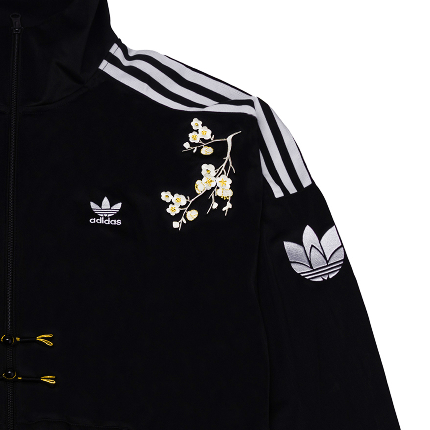 Это удобная спортивная повседневная ветрозащитная куртка adidas Originals RT TT U2 в полоску с воротником-стойкой в стиле ретро, унисекс, черного цвета. Центральный элемент дизайна - цветки сливы, представленные вышивкой. Различные формы цветков сливы сочетаются, а отделка золотыми нитями дополняет детали. Черно-золотые пуговицы с китайскими узелками завершают образ, придавая ему стильный и традиционный китайский стиль. Перед стиркой положите куртку в мешок.