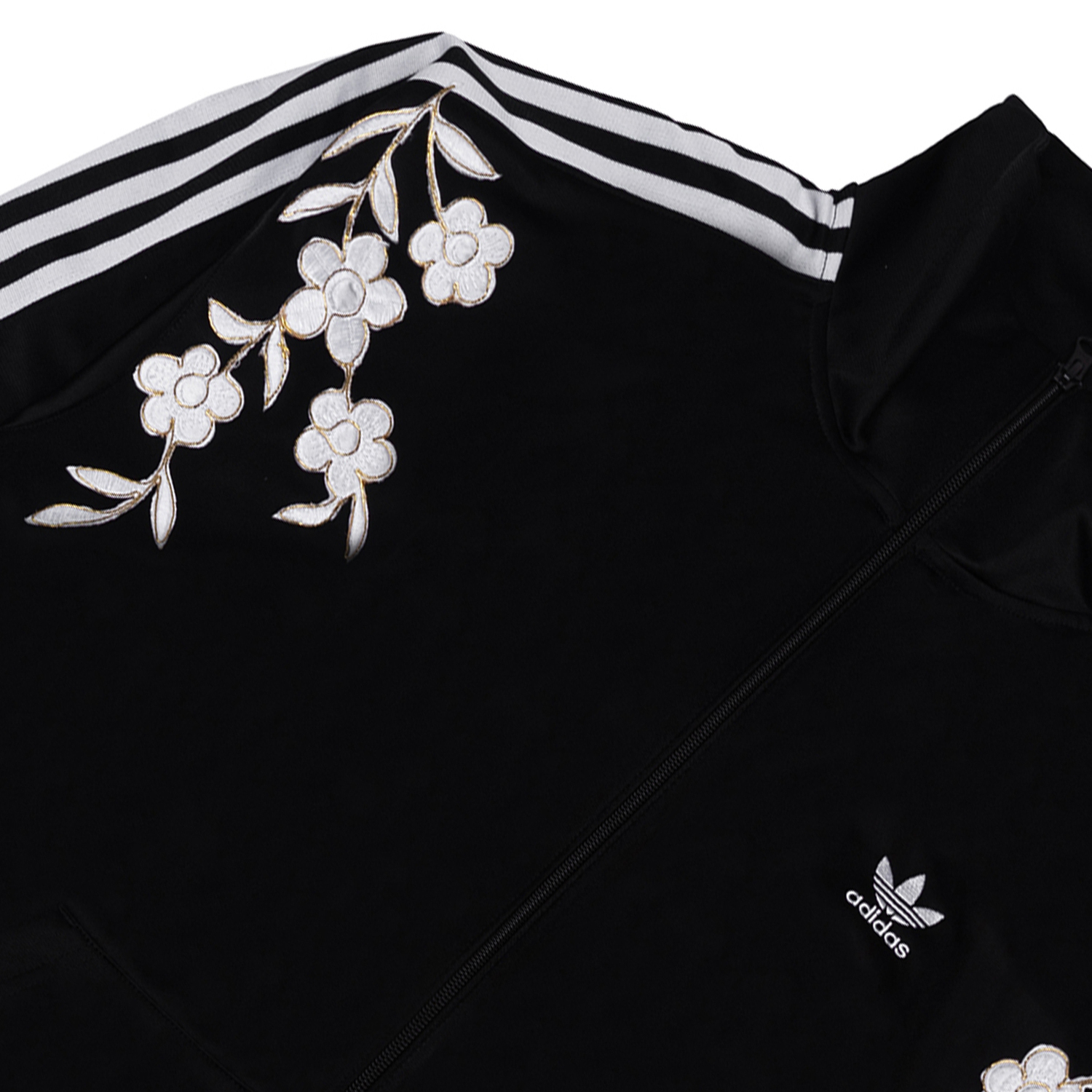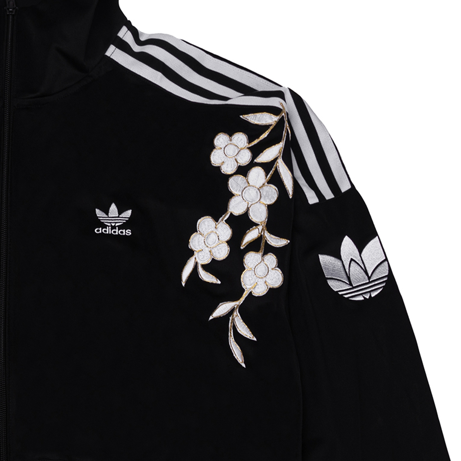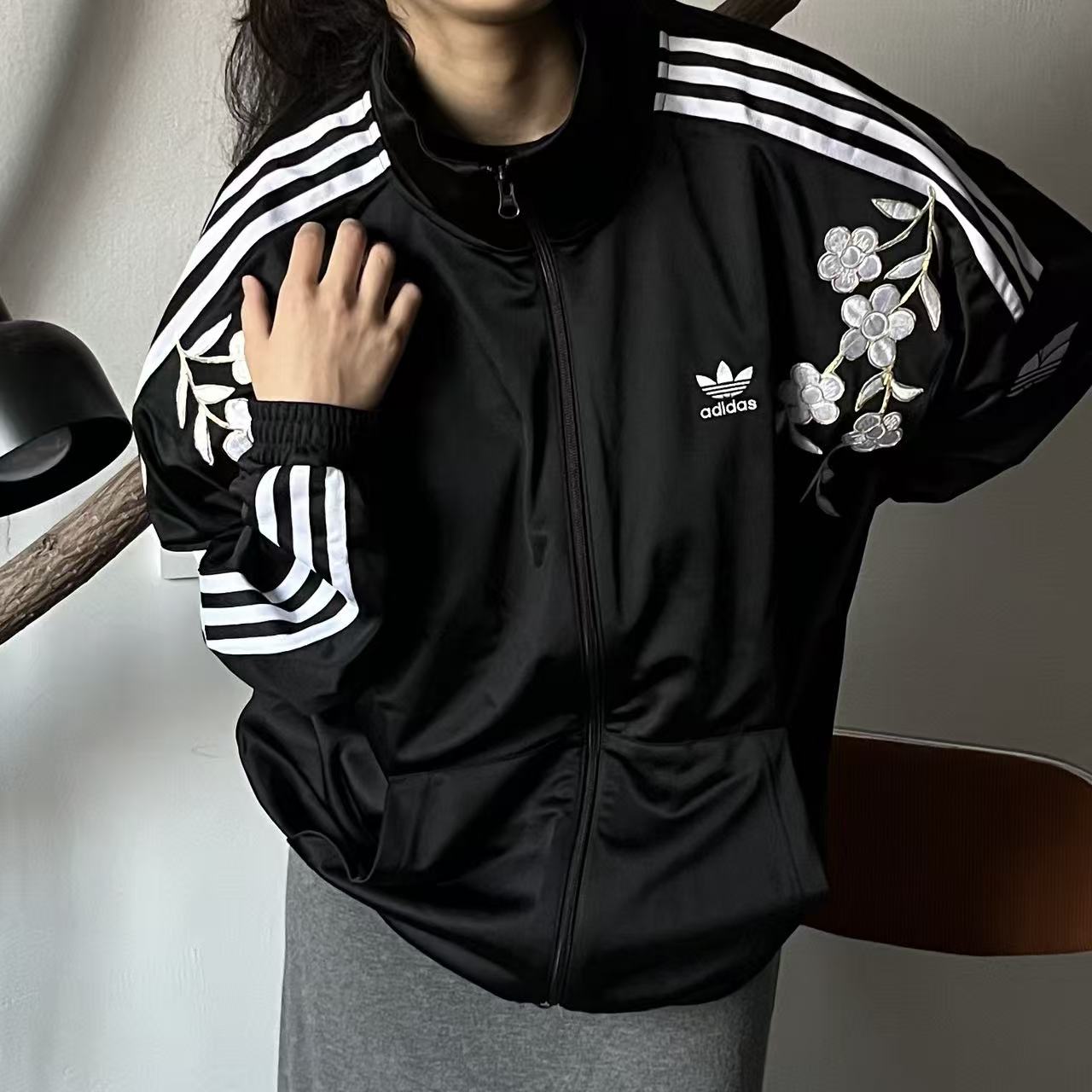 Это удобная спортивная куртка adidas Originals RT TT U2 в полоску с воротником-стойкой в стиле ретро, унисекс, черного цвета. В дизайне использованы нарциссы, представленные в виде вышивки. Различные формы нарциссов объединены и представлены в особой технике вышивки золотой нитью, что передает дух традиционного китайского стиля и современной моды. Перед стиркой, пожалуйста, положите куртку в мешок.