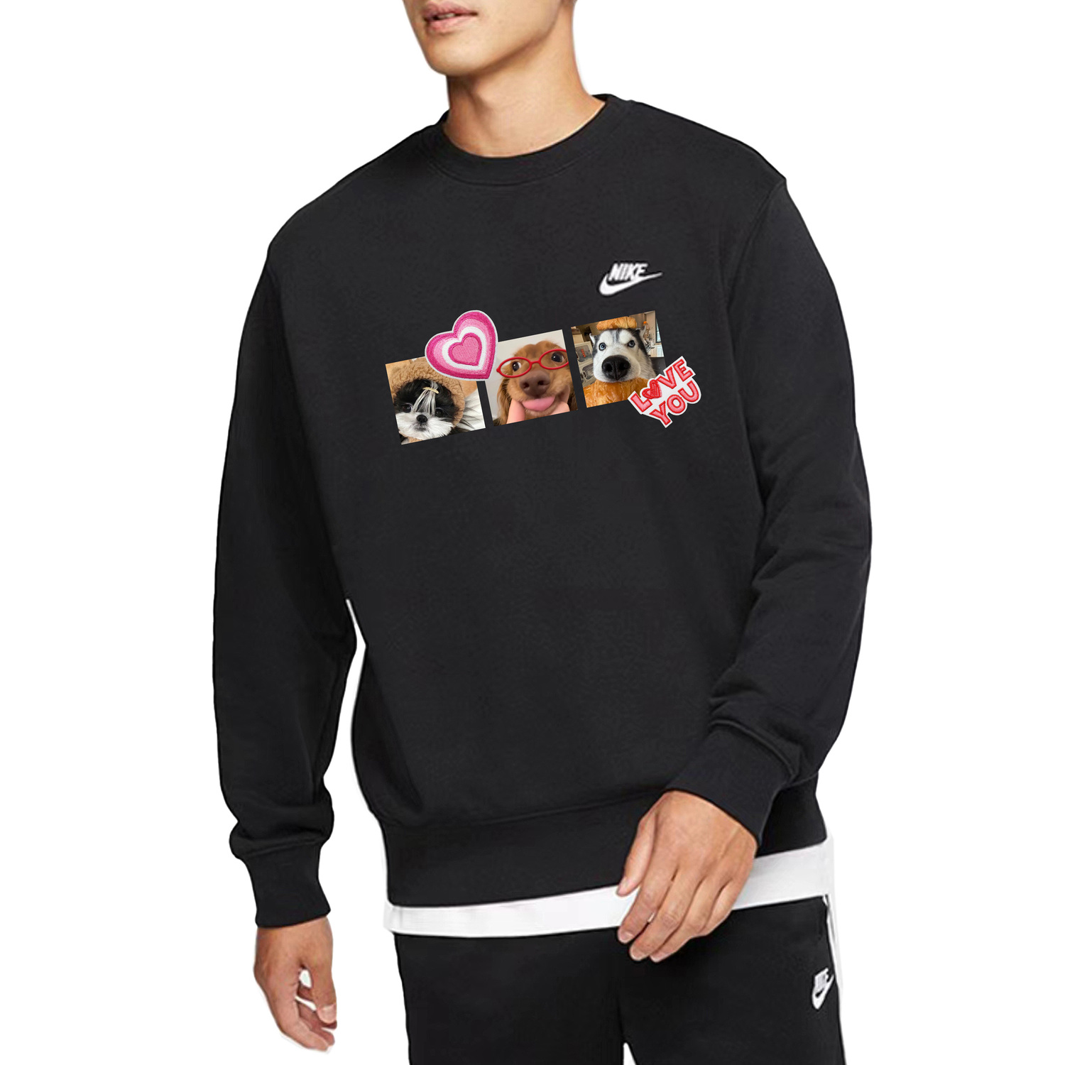Эта модель, сшитая на заказ, основана на оригинальной мужской толстовке Nike с длинными рукавами и круглым вырезом, весеннего стиля, черного цвета. На ней изображены очаровательные коты и собаки, а также изысканные вышитые вручную нашивки в виде сердец.